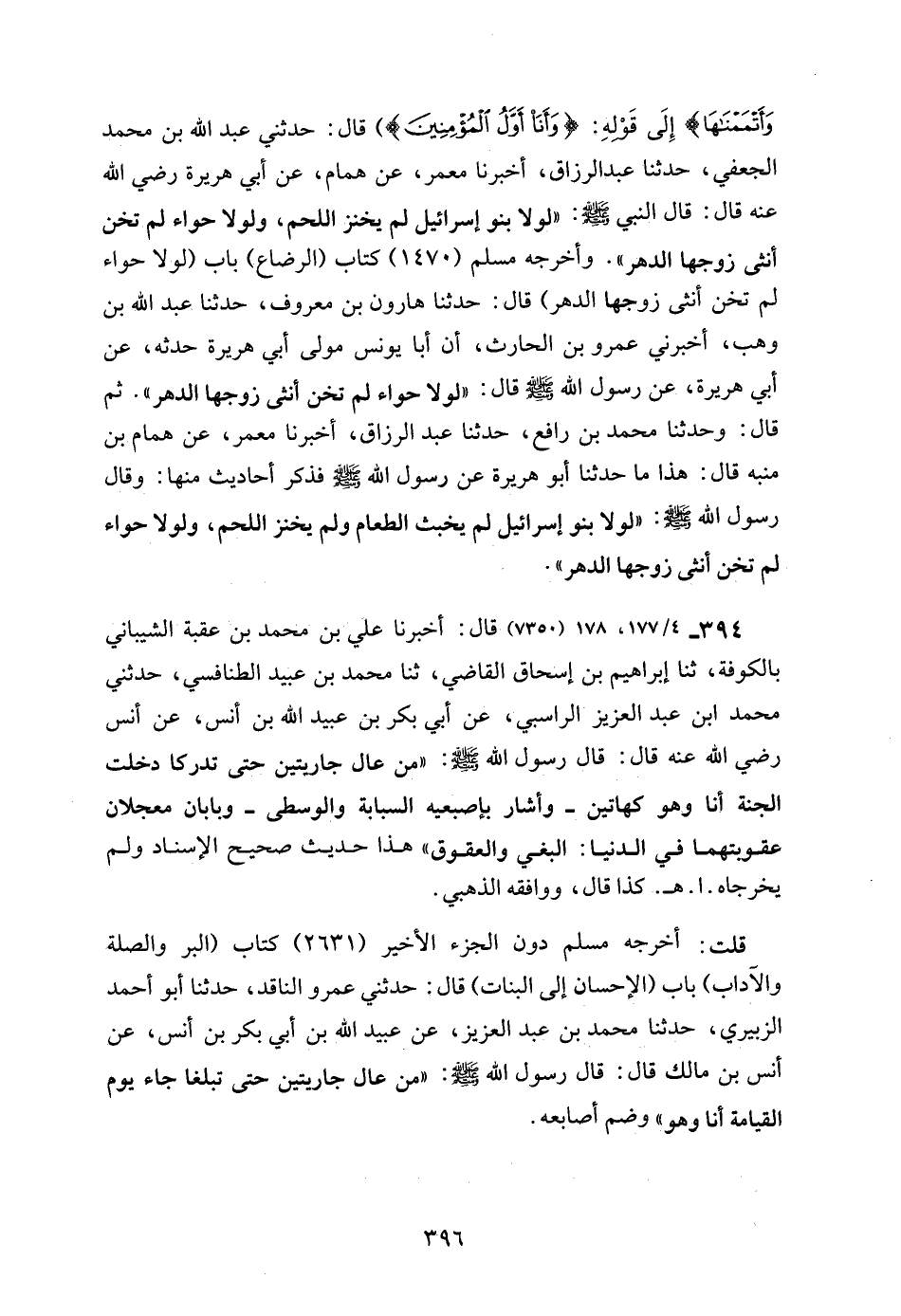 وَأَتْمَمْنَاهَا} إِلَى قَوْلِهِ: {وَأَنَا أَوَّلُ الْمُؤْمِنِينَ}) قال: حدثني عبد الله بن محمد الجعفي، حدثنا عبد الرزاق، أخبرنا معمر، عن همام، عن أبي هريرة رضي الله عنه قال: قال النبي - صلى الله عليه وسلم -: "لولا بنو إسرائيل لم يخنز اللحم، ولولا حواء لم تخن أنثى زوجها الدهر". وأخرجه مسلم (1470) كتاب (الرضاع) باب (لولا حواء لم تخن أنثى زوجها الدهر) قال: حدثنا هارون بن معروف، حدثنا عبد الله بن وهب، أخبرني عمرو بن الحارث، أن أبا يونس مولى أبي هريرة حدثه، عن أبي هريرة، عن رسول الله - صلى الله عليه وسلم - قال: "لولا حواء لم تخن أنثى زوجها الدهر". ثم قال: وحدثنا محمد بن رافع، حدثنا عبد الرزاق، أخبرنا معمر، عن همام بن منبه قال: هذا ما حدثنا أبو هريرة عن رسول الله - صلى الله عليه وسلم - فذكر أحاديث منها: وقال رسول الله - صلى الله عليه وسلم -: "لولا بنو إسرائيل لم يخبث الطعام ولم يخنز اللحم، ولولا حواء لم تخن أنثى زوجها الدهر".