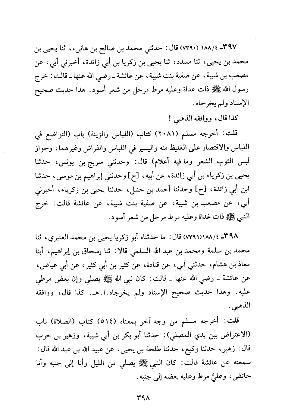 397 - 4/ 188 (7390) قال: حدثني محمد بن صالح بن هانىء، ثنا يحيى بن محمد بن يحيى، ثنا مسدد، ثنا يحيى بن زكريا بن أبي زائدة، أخبرني أبي، عن مصعب بن شيبة، عن صفية بنت شيبة، عن عائشة - رضي الله عنها - قالت: خرج رسول الله - صلى الله عليه وسلم - ذات غداة وعليه مرط مرحل من شعر أسود. هذا حديث صحيح الإسناد ولم يخرجاه.