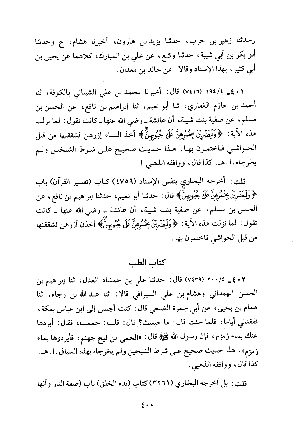 401 - 4/ 194 (7416) قال: أخبرنا محمد بن علي الشيباني بالكوفة، ثنا أحمد بن حازم الغفاري، ثنا أبو نعيم، ثنا إبراهيم بن نافع، عن الحسن بن مسلم، عن صفية بنت شيبة، أن عائشة - رضي الله عنها - كانت تقول: لما نزلت هذه الآية: {وَلْيَضْرِبْنَ بِخُمُرِهِنَّ عَلَى جُيُوبِهِنَّ} أخذ النساء إزرهن فشققنها من قبل الحواشي فاختمرن بها. هذا حديث صحيح على شرط الشيخين ولم يخرجاه. ا. هـ. كذا قال، ووافقه الذهبي!