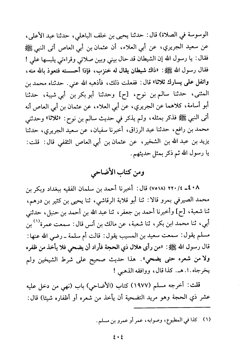 408 - 4/ 220 (7518) قال: أخبرنا أحمد بن سلمان الفقيه ببغداد وبكر بن محمد الصيرفي بمرو قالا: ثنا أبو قلابة الرقاشي، ثنا يحيى بن كثير بن درهم، ثنا شعبة، [ح] وأخبرنا أحمد بن جعفر، ثنا عبد الله بن أحمد بن حنبل، حدثني أبي، ثنا محمد ابن بكر، ثنا شعبة، عن مالك بن أنس قال: سمعت عمرة (¬1) بن مسلم يقول: سمعت سعيد بن المسيب يقول: قالت أم سلمة - رضي الله عنها: قال رسول الله - صلى الله عليه وسلم -: "من رأى هلال ذي الحجة فأراد أن يضحي فلا يأخذ من ظفره ولا من شعره حتى يضحي". هذا حديث صحيح على شرط الشيخين ولم يخرجاه. ا. هـ. كذا قال، ووافقه الذهبي!