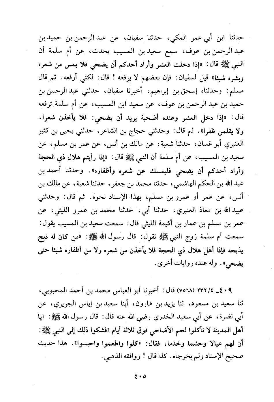 حدثنا ابن أبي عمر المكي، حدثنا سفيان، عن عبد الرحمن بن حميد بن عبد الرحمن بن عوف، سمع سعيد بن المسيب يحدث، عن أم سلمة أن النبي - صلى الله عليه وسلم - قال: "إذا دخلت العشر وأراد أحدكم أن يضحي فلا يمس من شعره وبشره شيئا" قيل لسفيان: فإن بعضهم لا يرفعه! قال: لكني أرفعه. ثم قال مسلم: وحدثناه إسحق بن إبراهيم، أخبرنا سفيان، حدثني عبد الرحمن بن حميد بن عبد الرحمن بن عوف، عن سعيد ابن المسيب، عن أم سلمة ترفعه قال: "إذا دخل العشر وعنده أضحية يريد أن يضحي: فلا يأخذن شعرا، ولا يقلمن ظفرا". ثم قال: وحدثني حجاج بن الشاعر، حدثني يحيى بن كثير العنبري أبو غسان، حدثنا شعبة، عن مالك بن أنس، عن عمر بن مسلم، عن سعيد بن المسيب، عن أم سلمة أن النبي - صلى الله عليه وسلم - قال: "إذا رأيتم هلال ذي الحجة وأراد أحدكم أن يضحي فليمسك عن شعره وأظفاره". وحدثنا أحمد بن عبد الله بن الحكم الهاشمي، حدثنا محمد بن جعفر، حدثنا شعبة، عن مالك بن أنس، عن عمر أو عمرو بن مسلم، بهذا الإسناد نحوه. ثم قال: وحدثني عبيد الله بن معاذ العنبري، حدثنا أبي، حدثنا محمد بن عمرو الليثي، عن عمر بن مسلم بن عمار بن أكيمة الليثي قال: سمعت سعيد بن المسيب يقول: سمعت أم سلمة زوج النبي - صلى الله عليه وسلم - تقول: قال رسول الله - صلى الله عليه وسلم -: "من كان له ذبح يذبحه فإذا أهل هلال ذي الحجة فلا يأخذن من شعره ولا من أظفاره شيئا حتى يضحي". وله عنده روايات أخرى.