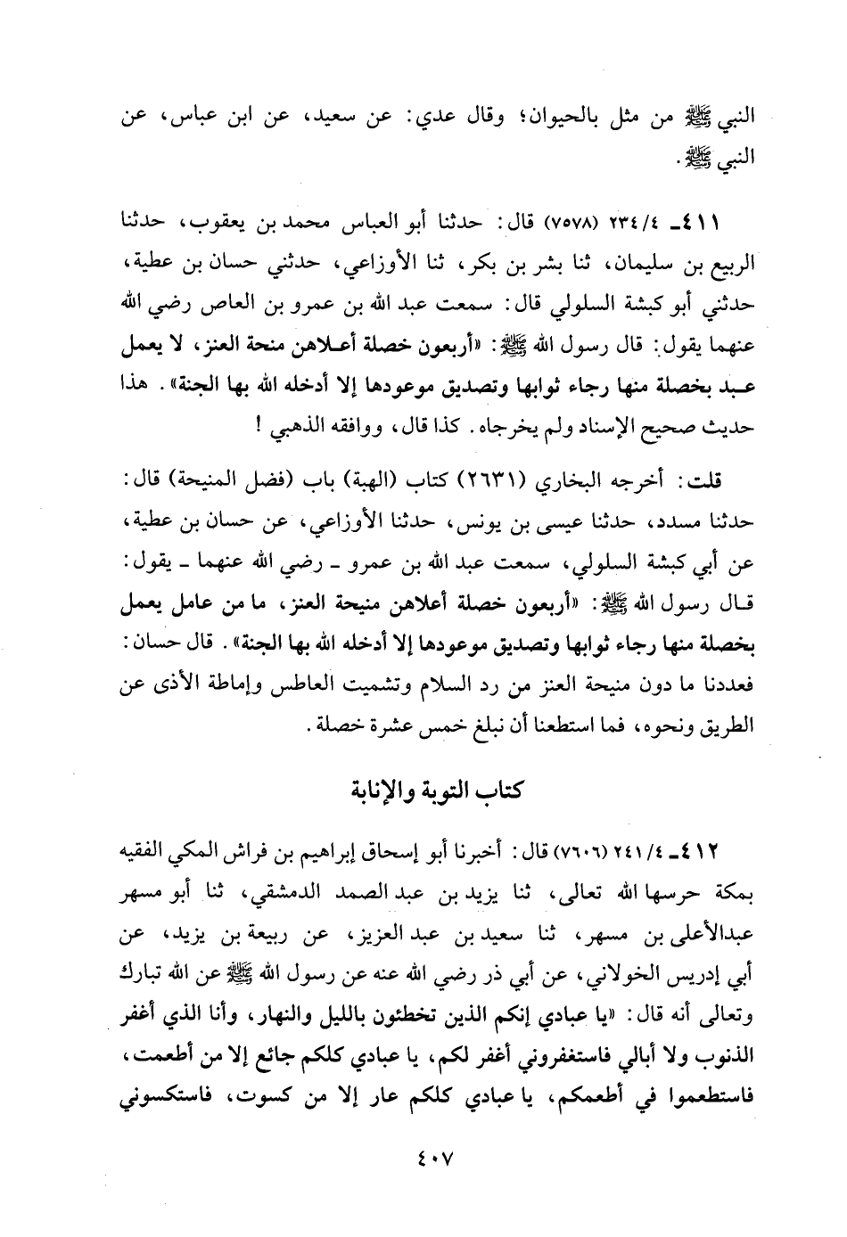 411 - 4/ 234 (7578) قال: حدثنا أبو العباس محمد بن يعقوب، حدثنا الربيع بن سليمان، ثنا بشر بن بكر، ثنا الأوزاعي، حدثني حسان بن عطية، حدثني أبو كبشة السلولي قال: سمعت عبد الله بن عمرو بن العاص رضي الله عنهما يقول: قال رسول الله - صلى الله عليه وسلم -: "أربعون خصلة أعلاهن منحة العنز، لا يعمل عبد بخصلة منها رجاء ثوابها وتصديق موعودها إلا أدخله الله بها الجنة". هذا حديث صحيح الإسناد ولم يخرجاه. كذا قال، ووافقه الذهبي!