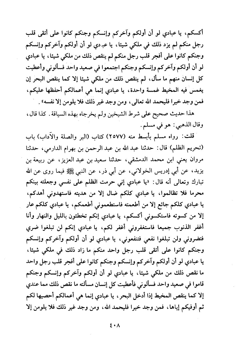 قلت: رواه مسلم بأبسط منه (2577) كتاب (البر والصلة والآداب) باب (تحريم الظلم) قال: حدثنا عبد الله بن عبد الرحمن بن بهرام الدارمي، حدثنا مروان يعني ابن محمد الدمشقي، حدثنا سعيد بن عبد العزيز، عن ربيعة بن يزيد، عن أبي إدريس الخولاني، عن أبي ذر، عن النبي - صلى الله عليه وسلم - فيما روى عن الله تبارك وتعالى أنه قال: "يا عبادي إني حرمت الظلم على نفسي وجعلته بينكم محرما فلا تظالموا، يا عبادي كلكم ضال إلا من هديته فاستهدوني أهدكم، يا عبادي كلكم جائع إلا من أطعمته فاستطعموني أطعمكم، يا عبادي كلكم عار إلا من كسوته فاستكسوني أكسكم، يا عبادي إنكم تخطئون بالليل والنهار وأنا أغفر الذنوب جميعا فاستغفروني أغفر لكم، يا عبادي إنكم لن تبلغوا ضري فتضروني ولن تبلغوا نفعي فتنفعوني، يا عبادي لو أن أولكم وآخركم وإنسكم وجنكم كانوا على أتقى قلب رجل واحد منكم ما زاد ذلك في ملكي شيئا، يا عبادي لو أن أولكم وآخركم وإنسكم وجنكم كانوا على أفجر قلب رجل واحد ما نقص ذلك من ملكي شيئا، يا عبادي لو أن أولكم وآخركم وإنسكم وجنكم قاموا في صعيد واحد فسألوني فأعطيت كل إنسان مسألته ما نقص ذلك مما عندي إلا كما ينقص المخيط إذا أدخل البحر، يا عبادي إنما هي أعمالكم أحصيها لكم ثم أوفيكم إياها، فمن وجد خيرا فليحمد الله، ومن وجد غير ذلك فلا يلومن إلا