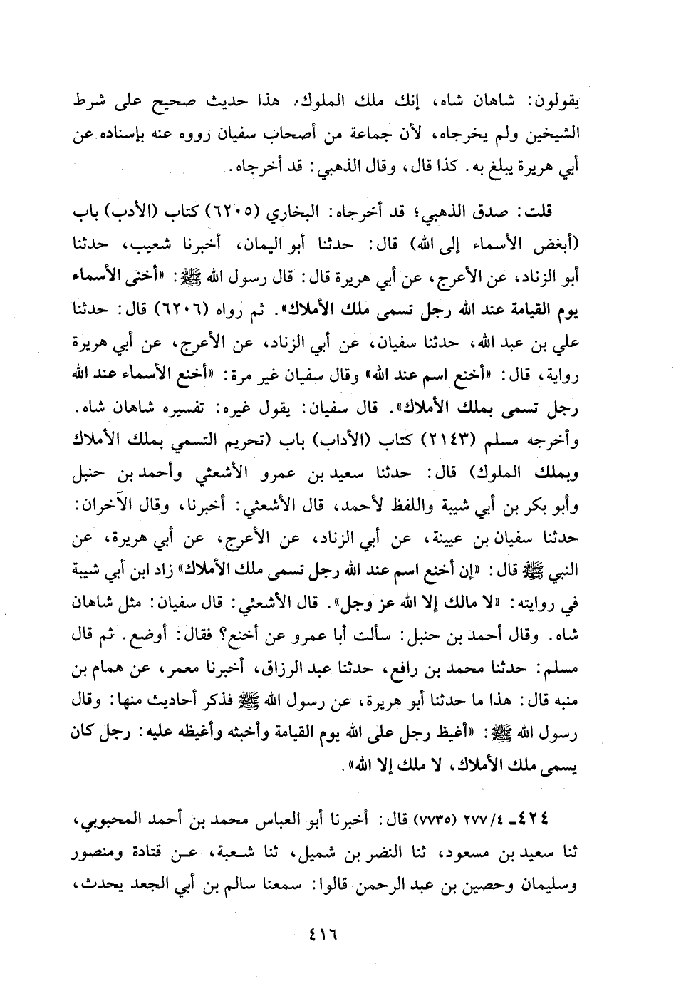 يقولون: شاهان شاه، إنك ملك الملوك: هذا حديث صحيح على شرط الشيخين ولم يخرجاه، لأن جماعة من أصحاب سفيان رووه عنه بإسناده عن أبي هريرة يبلغ به. كذا قال، وقال الذهبي: قد أخرجاه.