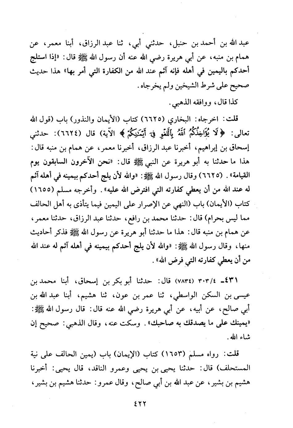 عبد الله بن أحمد بن حنبل، حدثني أبي، ثنا عبد الرزاق، أبنا معمر، عن همام بن منبه، عن أبي هريرة رضي الله عنه أن رسول الله - صلى الله عليه وسلم - قال: "إذا استلج أحدكم باليمين في أهله فإنه آثم عند الله من الكفارة التي أمر بها" هذا حديث صحيح على شرط الشيخين ولم يخرجاه.