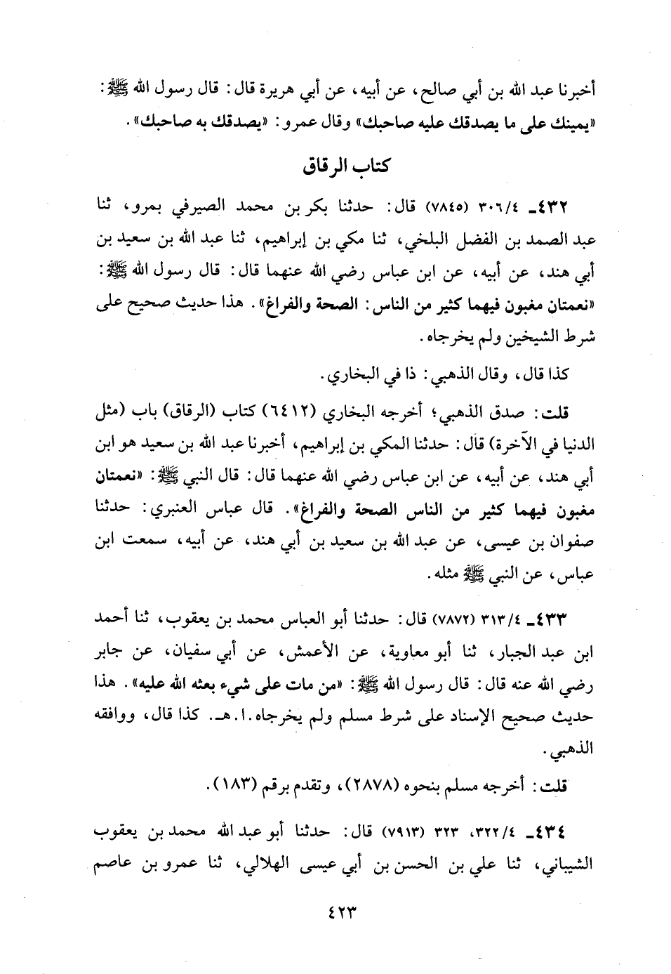 432 - 4/ 306 (7845) قال: حدثنا بكر بن محمد الصيرفي بمرو، ثنا عبد الصمد بن الفضل البلخي، ثنا مكي بن إبراهيم، ثنا عبد الله بن سعيد بن أبي هند، عن أبيه، عن ابن عباس رضي الله عنهما قال: قال رسول الله - صلى الله عليه وسلم -: "نعمتان مغبون فيهما كثير من الناس: الصحة والفراغ". هذا حديث صحيح على شرط الشيخين ولم يخرجاه.