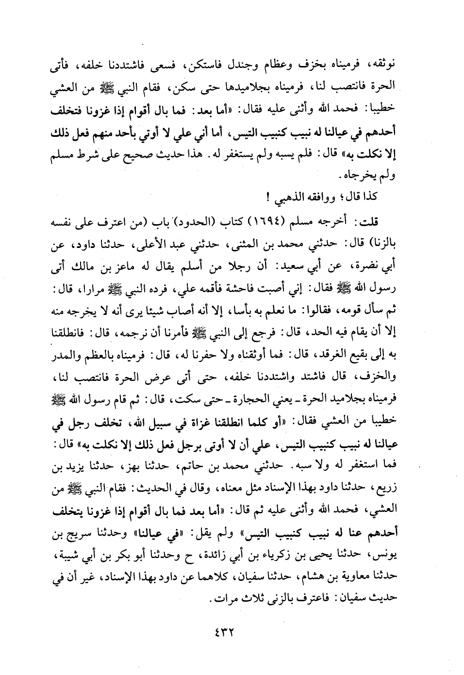 قلت: أخرجه مسلم (1694) كتاب (الحدود) باب (من اعترف على نفسه بالزنا) قال: حدثني محمد بن المثنى، حدثني عبد الأعلى، حدثنا داود، عن أبي نضرة، عن أبي سعيد: أن رجلا من أسلم يقال له ماعز بن مالك أتى رسول الله - صلى الله عليه وسلم - فقال: إني أصبت فاحشة فأقمه علي، فرده النبي - صلى الله عليه وسلم - مرارا، قال: ثم سأل قومه، فقالوا: ما نعلم به بأسا، إلا أنه أصاب شيئا يرى أنه لا يخرجه منه إلا أن يقام فيه الحد، قال: فرجع إلى النبي - صلى الله عليه وسلم - فأمرنا أن نرجمه، قال: فانطلقنا به إلى بقيع الغرقد، قال: فما أوثقناه ولا حفرنا له، قال: فرميناه بالعظم والمدر والخزف، قال فاشتد واشتددنا خلفه، حتى أتى عرض الحرة فانتصب لنا، فرميناه بجلاميد الحرة - يعني الحجارة - حتى سكت، قال: ثم قام رسول الله - صلى الله عليه وسلم - خطيبا من العشي فقال: "أو كلما انطلقنا غزاة في سبيل الله، تخلف رجل في عيالنا له نبيب كنبيب التيس، علي أن لا أوتى برجل فعل ذلك إلا نكلت به" قال: فما استغفر له ولا سبه. حدثني محمد بن حاتم، حدثنا بهز، حدثنا يزيد بن زريع، حدثنا داود بهذا الإسناد مثل معناه، وقال في الحديث: فقام النبي - صلى الله عليه وسلم - من العشي، فحمد الله وأثنى عليه ثم قال: "أما بعد فما بال أقوام إذا غزونا يتخلف أحدهم عنا له نبيب كنبيب التيس" ولم يقل: "في عيالنا" وحدثنا سريج بن يونس، حدثنا يحيى بن زكرياء بن أبي زائدة، ح وحدثنا أبو بكر بن أبي شيبة، حدثنا معاوية بن هشام، حدثنا سفيان، كلاهما عن داود بهذا الإسناد، غير أن في حديث سفيان: فاعترف بالزنى ثلاث مرات.