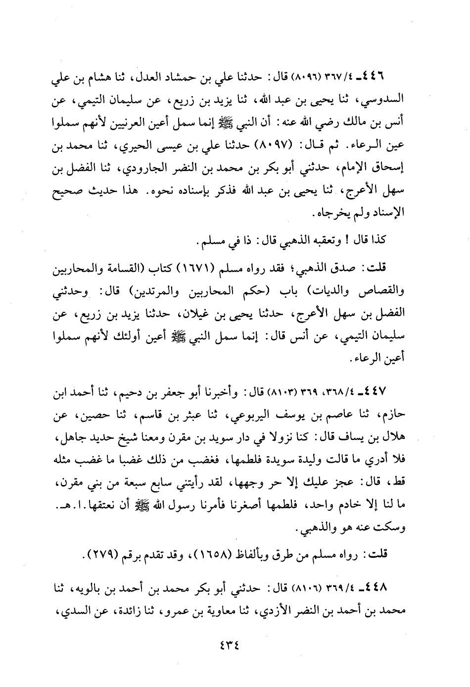 446 - 4/ 367 (8096) قال: حدثنا علي بن حمشاد العدل، ثنا هشام بن علي السدوسي، ثنا يحيى بن عبد الله، ثنا يزيد بن زريع، عن سليمان التيمي، عن أنس بن مالك رضي الله عنه: أن النبي - صلى الله عليه وسلم - إنما سمل أعين العرنيين لأنهم سملوا عين الرعاء. ثم قال: (8097) حدثنا علي بن عيسى الحيري، ثنا محمد بن إسحاق الإمام، حدثني أبو بكر بن محمد بن النضر الجارودي، ثنا الفضل بن سهل الأعرج، ثنا يحيى بن عبد الله فذكر بإسناده نحوه. هذا حديث صحيح الإسناد ولم يخرجاه.