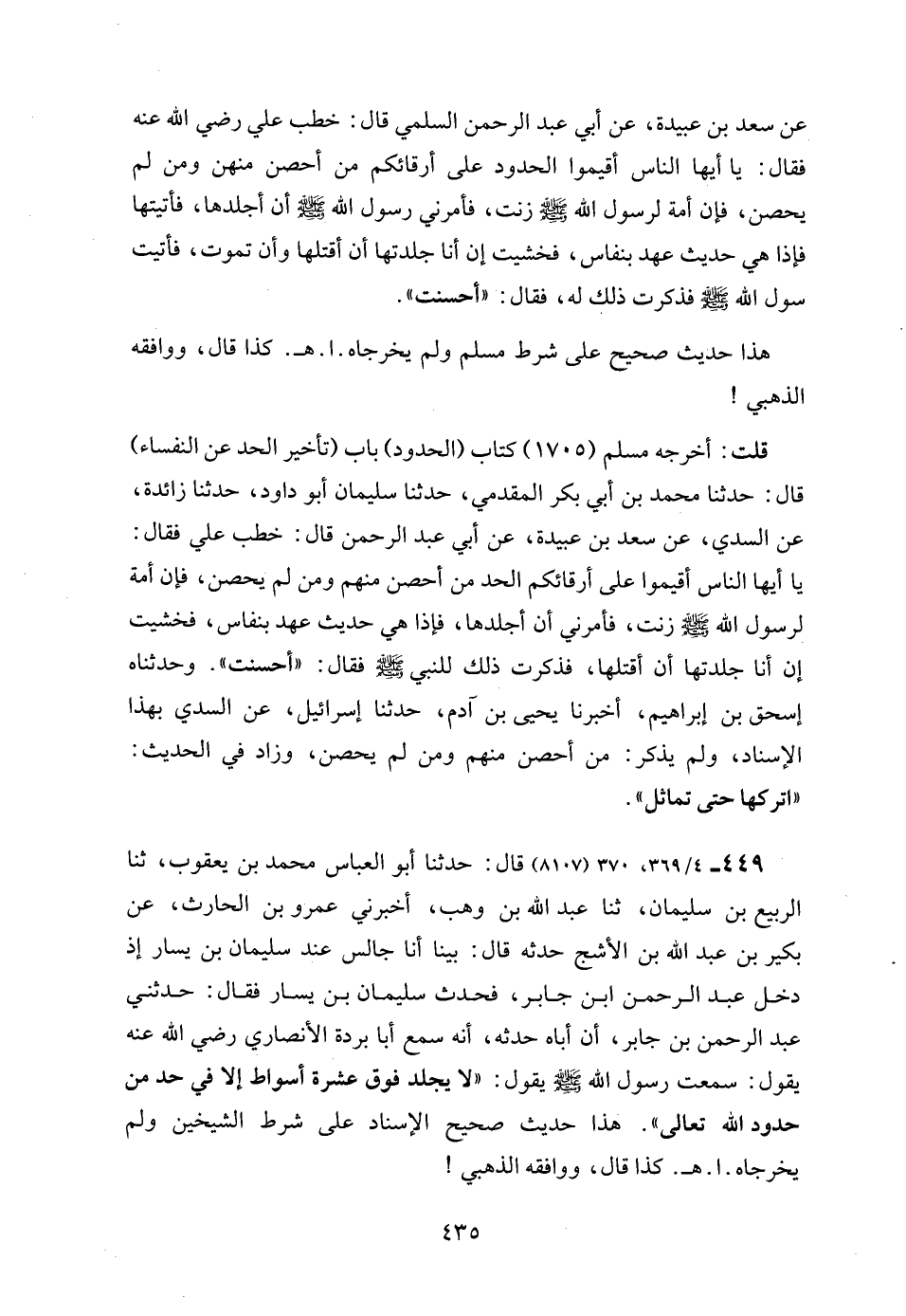 449 - 4/ 369، 370 (8107) قال: حدثنا أبو العباس محمد بن يعقوب، ثنا الربيع بن سليمان، ثنا عبد الله بن وهب، أخبرني عمرو بن الحارث، عن بكير بن عبد الله بن الأشج حدثه قال: بينا أنا جالس عند سليمان بن يسار إذ دخل عبد الرحمن ابن جابر، فحدث سليمان بن يسار فقال: حدثني عبد الرحمن بن جابر، أن أباه حدثه، أنه سمع أبا بردة الأنصاري رضي الله عنه يقول: سمعت رسول الله - صلى الله عليه وسلم - يقول: "لا يجلد فوق عشرة أسواط إلا في حد من حدود الله تعالى". هذا حديث صحيح الإسناد على شرط الشيخين ولم يخرجاه. ا. هـ. كذا قال، ووافقه الذهبي!