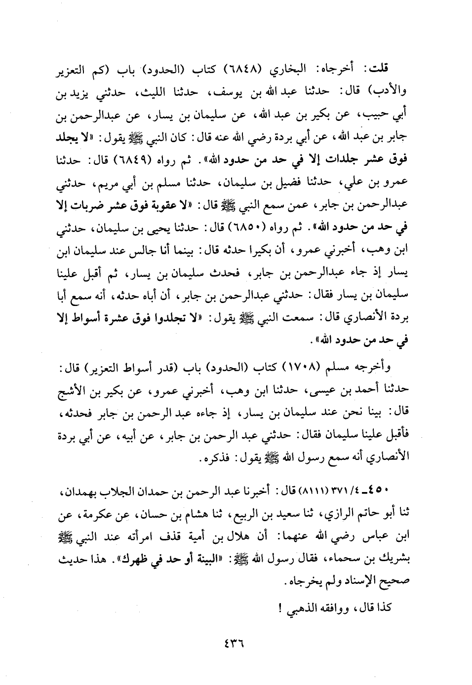 قلت: أخرجاه: البخاري (6848) كتاب (الحدود) باب (كم التعزير والأدب) قال: حدثنا عبد الله بن يوسف، حدثنا الليث، حدثني يزيد بن أبي حبيب، عن بكير بن عبد الله، عن سليمان بن يسار، عن عبد الرحمن بن جابر بن عبد الله، عن أبي بردة رضي الله عنه قال: كان النبي - صلى الله عليه وسلم - يقول: "لا يجلد فوق عشر جلدات إلا في حد من حدود الله". ثم رواه (6849) قال: حدثنا عمرو بن علي، حدثنا فضيل بن سليمان، حدثنا مسلم بن أبي مريم، حدثني عبد الرحمن بن جابر، عمن سمع النبي - صلى الله عليه وسلم - قال: "لا عقوبة فوق عشر ضربات إلا في حد من حدود الله". ثم رواه (6850) قال: حدثنا يحيى بن سليمان، حدثني ابن وهب، أخبرني عمرو، أن بكيرا حدثه قال: بينما أنا جالس عند سليمان ابن يسار إذ جاء عبد الرحمن بن جابر، فحدث سليمان بن يسار، ثم أقبل علينا سليمان بن يسار فقال: حدثني عبد الرحمن بن جابر، أن أباه حدثه، أنه سمع أبا بردة الأنصاري قال: سمعت النبي - صلى الله عليه وسلم - يقول: "لا تجلدوا فوق عشرة أسواط إلا في حد من حدود الله".