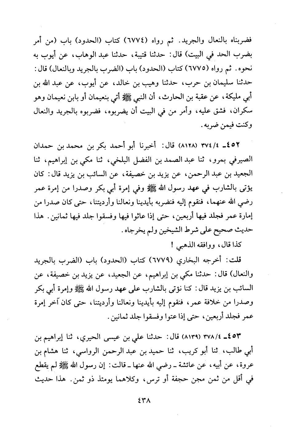 452 - 4/ 374 (8128) قال: أخبرنا أبو أحمد بكر بن محمد بن حمدان الصيرفي بمرو، ثنا عبد الصمد بن الفضل البلخي، ثنا مكي بن إبراهيم، ثنا الجعيد بن عبد الرحمن، عن يزيد بن خصيفة، عن السائب بن يزيد قال: كان يؤتى بالشارب في عهد رسول الله - صلى الله عليه وسلم - وفي إمرة أبي بكر وصدرا من إمرة عمر رضي الله عنهما، فنقوم إليه فنضربه بأيدينا ونعالنا وأرديتنا، حتى كان صدرا من إمارة عمر فجلد فيها أربعين، حتى إذا عاثوا فيها وفسقوا جلد فيها ثمانين. هذا حديث صحيح على شرط الشيخين ولم يخرجاه.