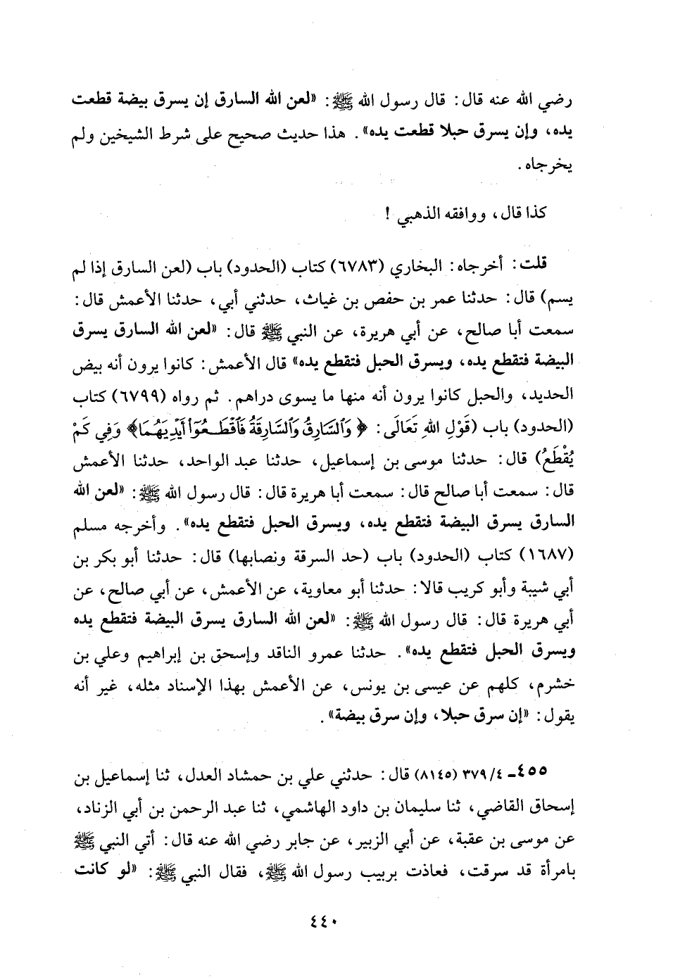 رضي الله عنه قال: قال رسول الله - صلى الله عليه وسلم -: "لعن الله السارق إن يسرق بيضة قطعت يده، وإن يسرق حبلا قطعت يده". هذا حديث صحيح على شرط الشيخين ولم يخرجاه.