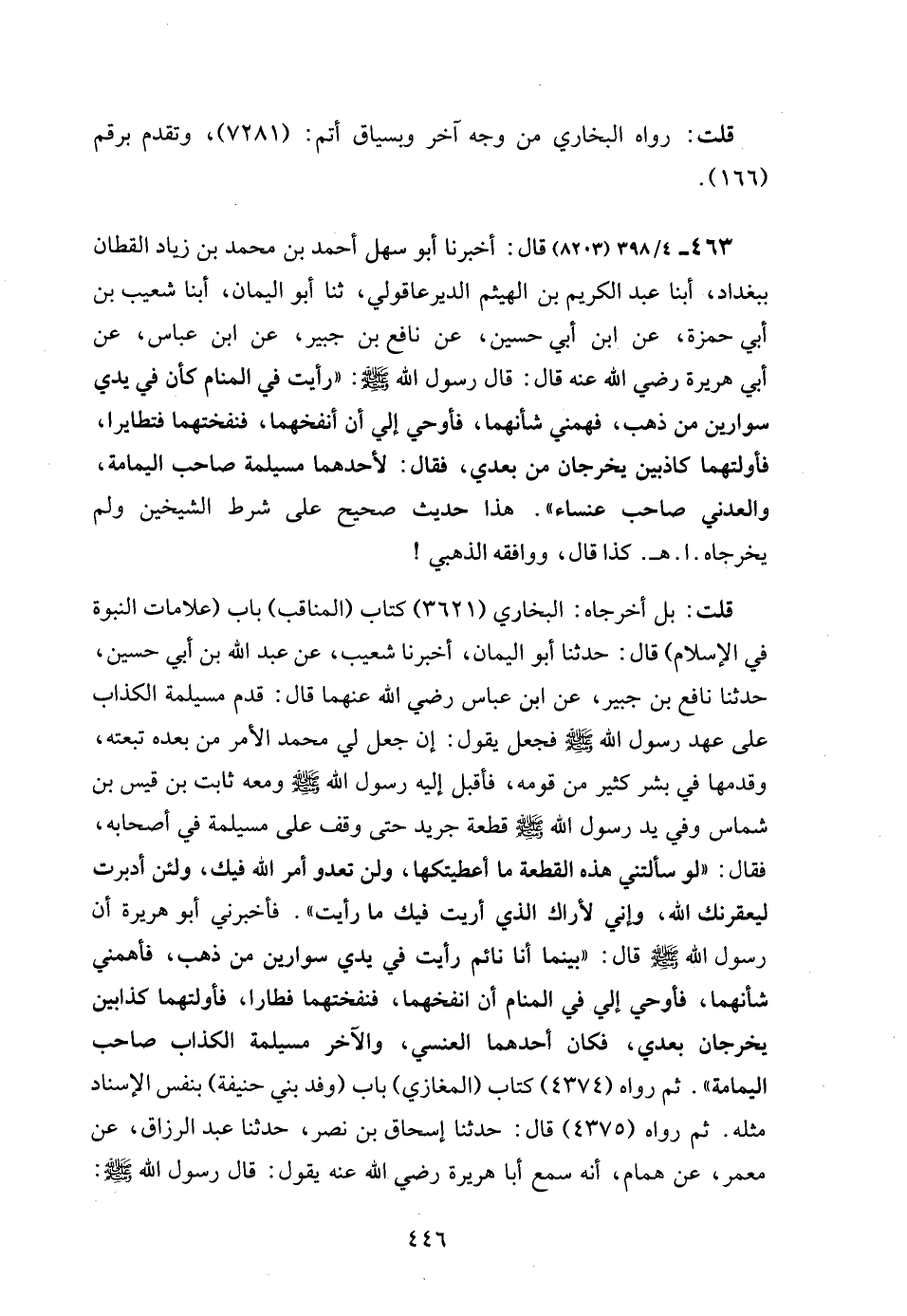 463 - 4/ 398 (8203) قال: أخبرنا أبو سهل أحمد بن محمد بن زياد القطان ببغداد، أبنا عبد الكريم بن الهيثم الديرعاقولي، ثنا أبو اليمان، أبنا شعيب بن أبي حمزة، عن ابن أبي حسين، عن نافع بن جبير، عن ابن عباس، عن أبي هريرة رضي الله عنه قال: قال رسول الله - صلى الله عليه وسلم -: "رأيت في المنام كأن في يدي سوارين من ذهب، فهمني شأنهما، فأوحي إلي أن أنفخهما، فنفختهما فتطايرا، فأولتهما كاذبين يخرجان من بعدي، فقال: لأحدهما مسيلمة صاحب اليمامة، والعدني صاحب عنساء". هذا حديث صحيح على شرط الشيخين ولم يخرجاه. ا. هـ. كذا قال، ووافقه الذهبي!