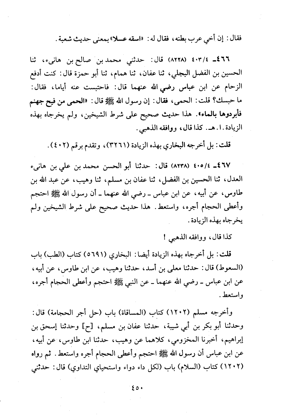 467 - 4/ 405 (8238) قال: حدثنا أبو الحسن محمد بن علي بن هانئ العدل، ثنا الحسين بن الفضل، ثنا عفان بن مسلم، ثنا وهيب، عن عبد الله بن طاوس، عن أبيه، عن ابن عباس - رضي الله عنهما - أن رسول الله - صلى الله عليه وسلم - احتجم وأعطى الحجام أجره، واستعط. هذا حديث صحيح على شرط الشيخين ولم يخرجاه بهذه الزيادة.