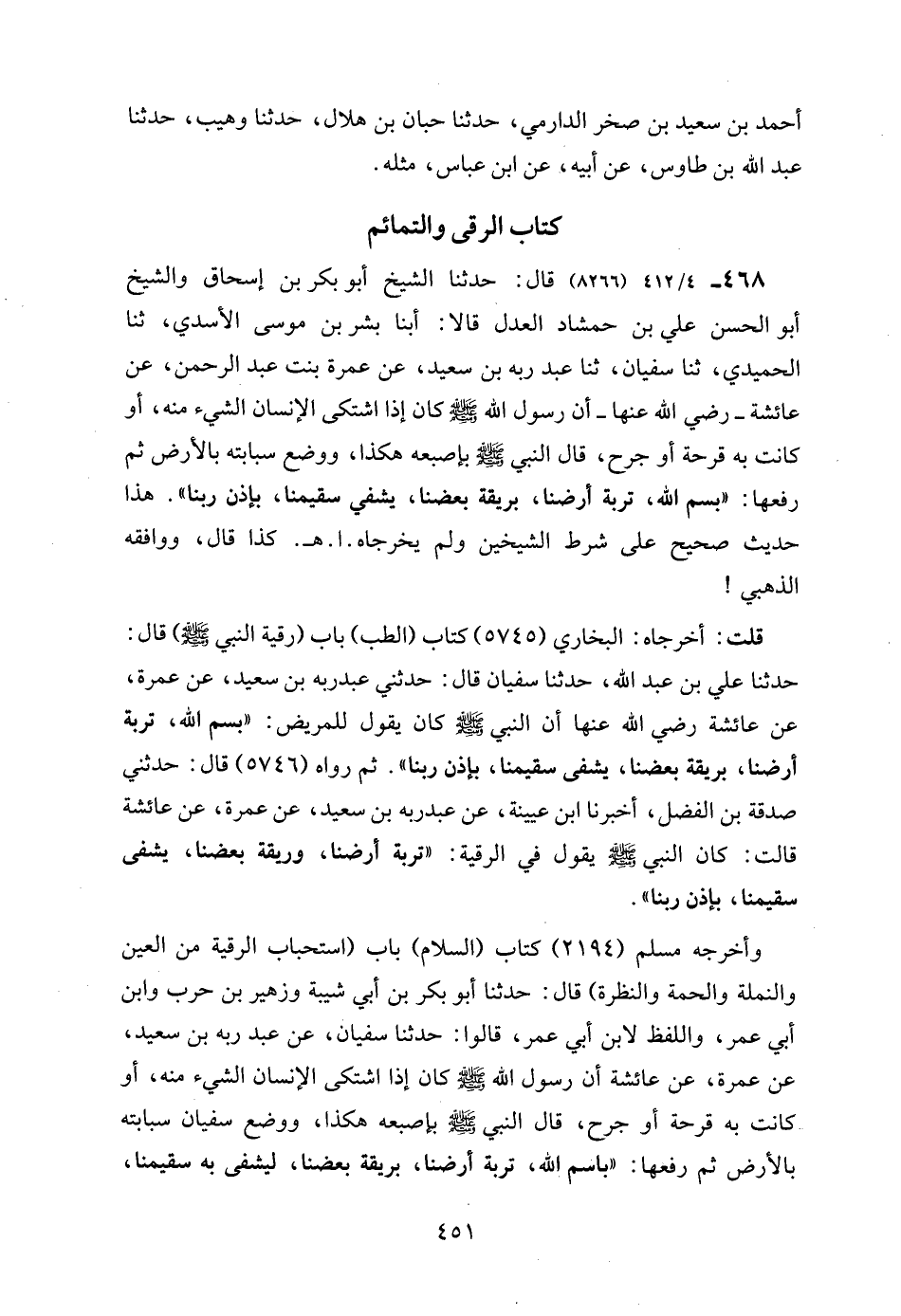 468 - 4/ 412 (8266) قال: حدثنا الشيخ أبو بكر بن إسحاق والشيخ أبو الحسن علي بن حمشاد العدل قالا: أبنا بشر بن موسى الأسدي، ثنا الحميدي، ثنا سفيان، ثنا عبد ربه بن سعيد، عن عمرة بنت عبد الرحمن، عن عائشة - رضي الله عنها - أن رسول الله - صلى الله عليه وسلم - كان إذا اشتكى الإنسان الشيء منه، أو كانت به قرحة أو جرح، قال النبي - صلى الله عليه وسلم - بإصبعه هكذا، ووضع سبابته بالأرض ثم رفعها: "بسم الله، تربة أرضنا، بريقة بعضنا، يشفي سقيمنا، بإذن ربنا". هذا حديث صحيح على شرط الشيخين ولم يخرجاه. ا. هـ. كذا قال، ووافقه الذهبي!