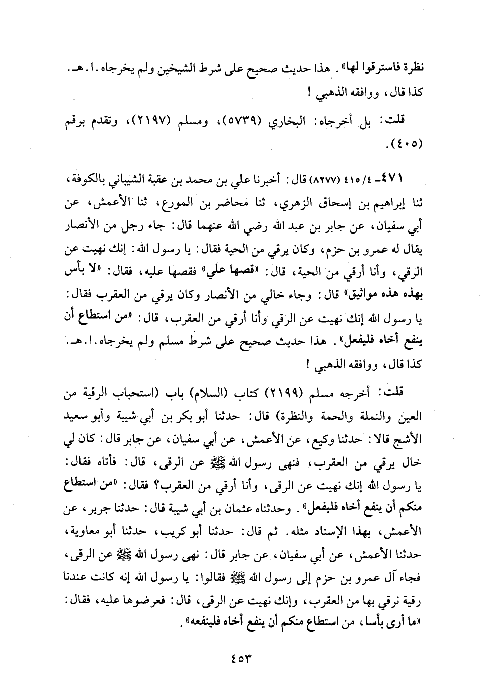 471 - 4/ 415 (8277) قال: أخبرنا علي بن محمد بن عقبة الشيباني بالكوفة، ثنا إبراهيم بن إسحاق الزهري، ثنا محاضر بن المورع، ثنا الأعمش، عن أبي سفيان، عن جابر بن عبد الله رضي الله عنهما قال: جاء رجل من الأنصار يقال له عمرو بن حزم، وكان يرقي من الحية فقال: يا رسول الله: إنك نهيت عن الرقي، وأنا أرقي من الحية، قال: "قصها علي" فقصها عليه، فقال: "لا بأس بهذه هذه مواثيق" قال: وجاء خالي من الأنصار وكان يرقي من العقرب فقال: يا رسول الله إنك نهيت عن الرقي وأنا أرقي من العقرب، قال: "من استطاع أن ينفع أخاه فليفعل". هذا حديث صحيح على شرط مسلم ولم يخرجاه. ا. هـ. كذا قال، ووافقه الذهبي!
