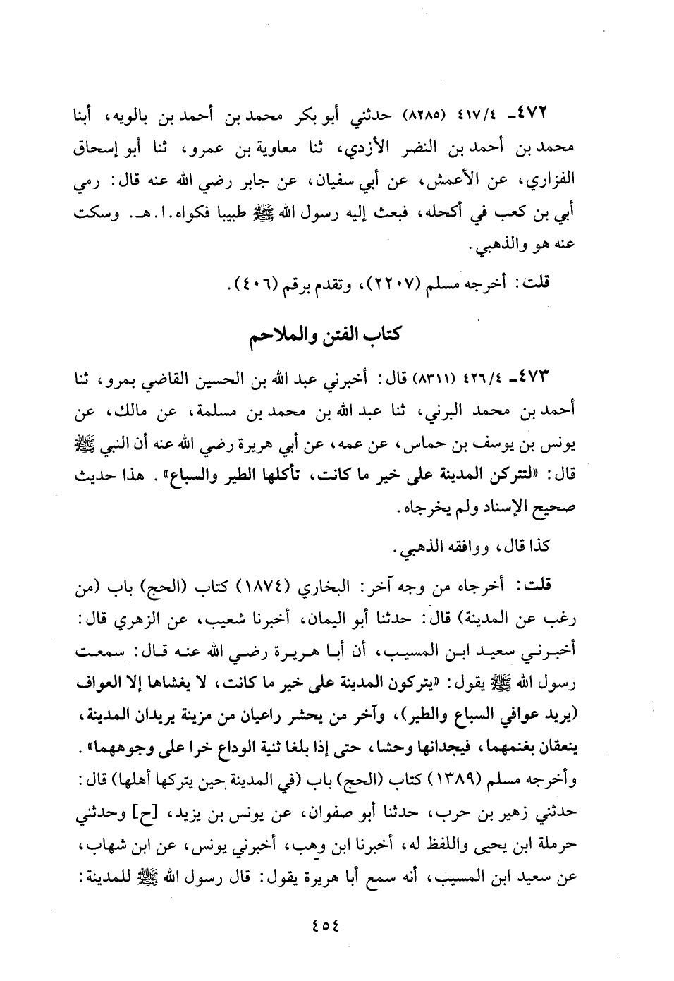 473 - 4/ 426 (8311) قال: أخبرني عبد الله بن الحسين القاضي بمرو، ثنا أحمد بن محمد البرني، ثنا عبد الله بن محمد بن مسلمة، عن مالك، عن يونس بن يوسف بن حماس، عن عمه، عن أبي هريرة رضي الله عنه أن النبي - صلى الله عليه وسلم - قال: "لتتركن المدينة على خير ما كانت، تأكلها الطير والسباع". هذا حديث صحيح الإسناد ولم يخرجاه.