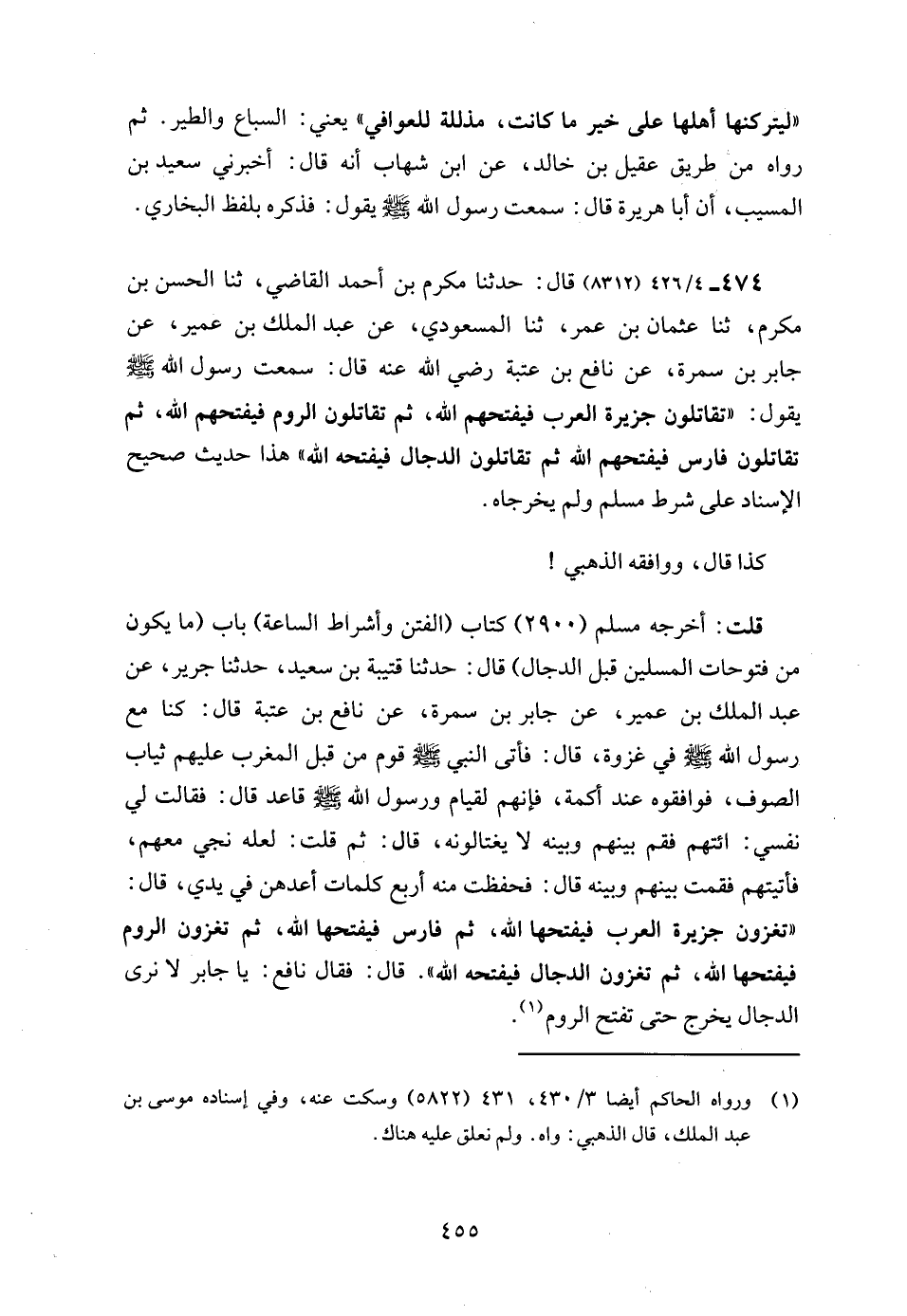 474 - 4/ 426 (8312) قال: حدثنا مكرم بن أحمد القاضي، ثنا الحسن بن مكرم، ثنا عثمان بن عمر، ثنا المسعودي، عن عبد الملك بن عمير، عن جابر بن سمرة، عن نافع بن عتبة رضي الله عنه قال: سمعت رسول الله - صلى الله عليه وسلم - يقول: "تقاتلون جزيرة العرب فيفتحهم الله، ثم تقاتلون الروم فيفتحهم الله، ثم تقاتلون فارس فيفتحهم الله ثم تقاتلون الدجال فيفتحه الله" هذا حديث صحيح الإسناد على شرط مسلم ولم يخرجاه.
