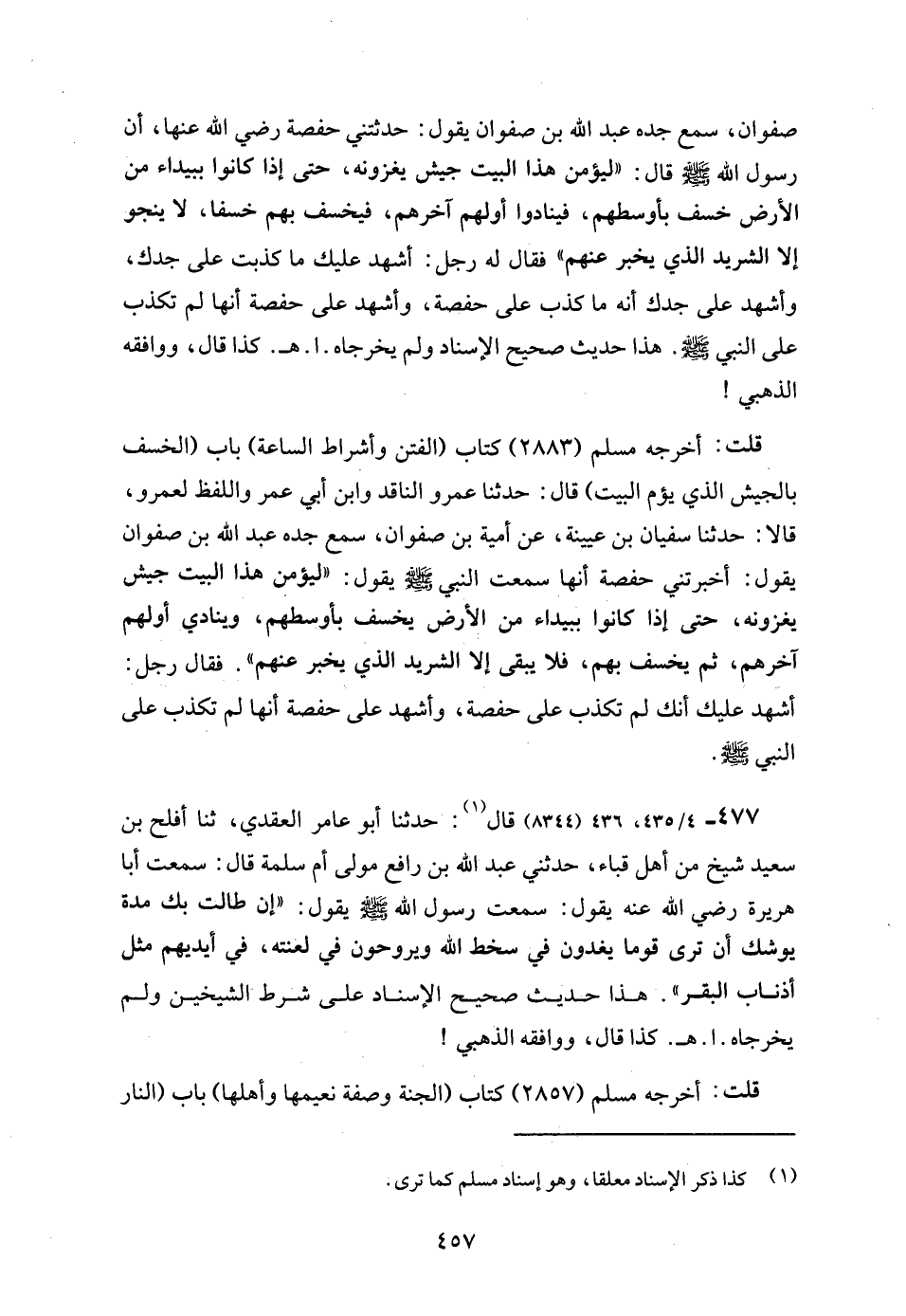 صفوان، سمع جده عبد الله بن صفوان يقول: حدثتني حفصة رضي الله عنها، أن رسول الله - صلى الله عليه وسلم - قال: "ليؤمن هذا البيت جيش يغزونه، حتى إذا كانوا ببيداء من الأرض خسف بأوسطهم، فينادوا أولهم آخرهم، فيخسف بهم خسفا، لا ينجو إلا الشريد الذي يخبر عنهم" فقال له رجل: أشهد عليك ما كذبت على جدك، وأشهد على جدك أنه ما كذب على حفصة، وأشهد على حفصة أنها لم تكذب على النبي - صلى الله عليه وسلم -. هذا حديث صحيح الإسناد ولم يخرجاه. ا. هـ. كذا قال، ووافقه الذهبي!