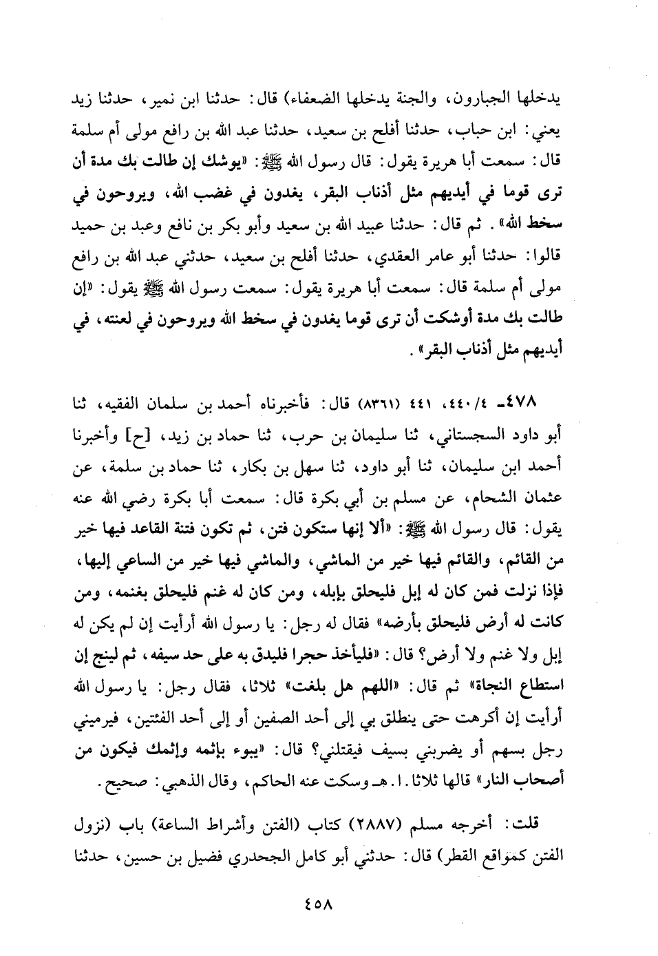 478 - 4/ 440، 441 (8361) قال: فأخبرناه أحمد بن سلمان الفقيه، ثنا أبو داود السجستاني، ثنا سليمان بن حرب، ثنا حماد بن زيد، [ح] وأخبرنا أحمد ابن سليمان، ثنا أبو داود، ثنا سهل بن بكار، ثنا حماد بن سلمة، عن عثمان الشحام، عن مسلم بن أبي بكرة قال: سمعت أبا بكرة رضي الله عنه يقول: قال رسول الله - صلى الله عليه وسلم -: "ألا إنها ستكون فتن، ثم تكون فتنة القاعد فيها خير من القائم، والقائم فيها خير من الماشي، والماشي فيها خير من الساعي إليها، فإذا نزلت فمن كان له إبل فليحلق بإبله، ومن كان له غنم فليحلق بغنمه، ومن كانت له أرض فليحلق بأرضه" فقال له رجل: يا رسول الله أرأيت إن لم يكن له إبل ولا غنم ولا أرض؟ قال: "فليأخذ حجرا فليدق به على حد سيفه، ثم لينج إن استطاع النجاة" ثم قال: "اللهم هل بلغت" ثلاثا، فقال رجل: يا رسول الله أرأيت إن اكرهت حتى ينطلق بي إلى أحد الصفين أو إلى أحد الفئتين، فيرميني رجل بسهم أو يضربني بسيف فيقتلني؟ قال: "يبوء بإثمه وإثمك فيكون من أصحاب النار" قالها ثلاثا. ا. هـ وسكت عنه الحاكم، وقال الذهبي: صحيح.