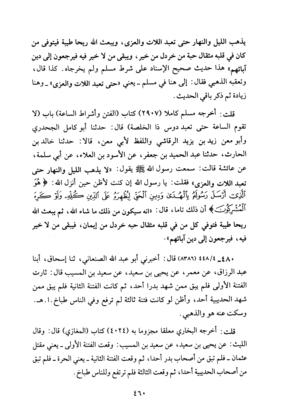 يذهب الليل والنهار حتى تعبد اللات والعزى، ويبعث الله ريحا طيبة فيتوفى من كان في قلبه مثقال حبة من خردل من خير، ويبقى من لا خير فيه فيرجعون إلى دين آبائهم" هذا حديث صحيح الإسناد على شرط مسلم ولم يخرجاه. كذا قال، وتعقبه الذهبي فقال: إلى هنا في مسلم - يعني "حتى تعبد اللات والعزى" - وهنا زيادة ثم ذكر باقي الحديث.