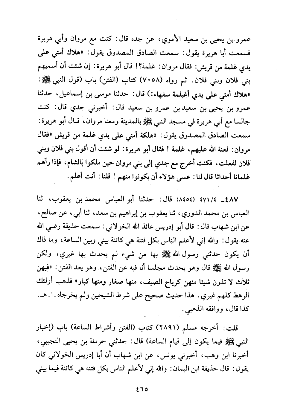 487 - 4/ 471 (8454) قال: حدثنا أبو العباس محمد بن يعقوب، ثنا العباس بن محمد الدوري، ثنا يعقوب بن إبراهيم بن سعد، ثنا أبي، عن صالح، عن ابن شهاب قال: قال أبو إدريس عائذ الله الخولاني: سمعت حذيفة رضي الله عنه يقول: والله إني لأعلم الناس بكل فتنة هي كائنة بيني وبين الساعة، وما ذاك أن يكون حدثني رسول الله - صلى الله عليه وسلم - بها من شيء لم يحدث بها غيري، ولكن رسول الله - صلى الله عليه وسلم - قال وهو يحدث مجلسا أنا فيه عن الفتن، وهو يعد الفتن: "فيهن ثلاث لا تذرن شيئا منهن كرياح الصيف، منها صغار ومنها كبار" فذهب أولئك الرهط كلهم غيري. هذا حديث صحيح على شرط الشيخين ولم يخرجاه. ا. هـ. كذا قال، ووافقه الذهبي.