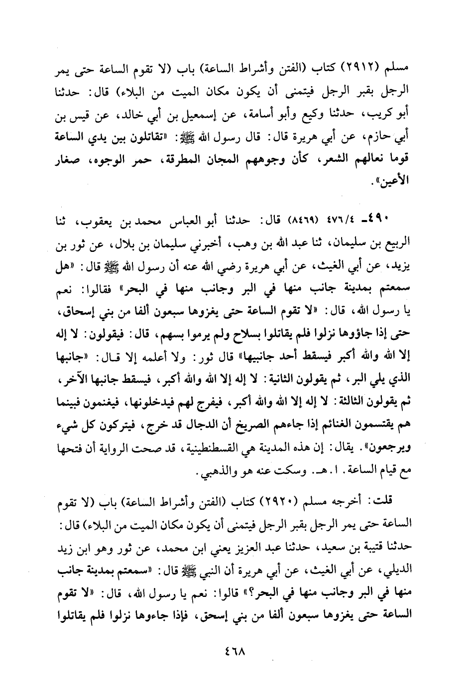 490 - 4/ 476 (8469) قال: حدثنا أبو العباس محمد بن يعقوب، ثنا الربيع بن سليمان، ثنا عبد الله بن وهب، أخبرني سليمان بن بلال، عن ثور بن يزيد، عن أبي الغيث، عن أبي هريرة رضي الله عنه أن رسول الله - صلى الله عليه وسلم - قال: "هل سمعتم بمدينة جانب منها في البر وجانب منها في البحر" فقالوا: نعم يا رسول الله، قال: "لا تقوم الساعة حتى يغزوها سبعون ألفا من بني إسحاق، حتى إذا جاؤوها نزلوا فلم يقاتلوا بسلاح ولم يرموا بسهم، قال: فيقولون: لا إله إلا الله والله أكبر فيسقط أحد جانبيها" قال ثور: ولا أعلمه إلا قال: "جانبها الذي يلي البر، ثم يقولون الثانية: لا إله إلا الله والله أكبر، فيسقط جانبها الآخر، ثم يقولون الثالثة: لا إله إلا الله والله أكبر، فيفرج لهم فيدخلونها، فيغنمون فبينما هم يقتسمون الغنائم إذا جاءهم الصريخ أن الدجال قد خرج، فيتركون كل شيء ويرجعون". يقال: إن هذه المدينة هي القسطنطينية، قد صحت الرواية أن فتحها مع قيام الساعة. ا. هـ. وسكت عنه هو والذهبي.