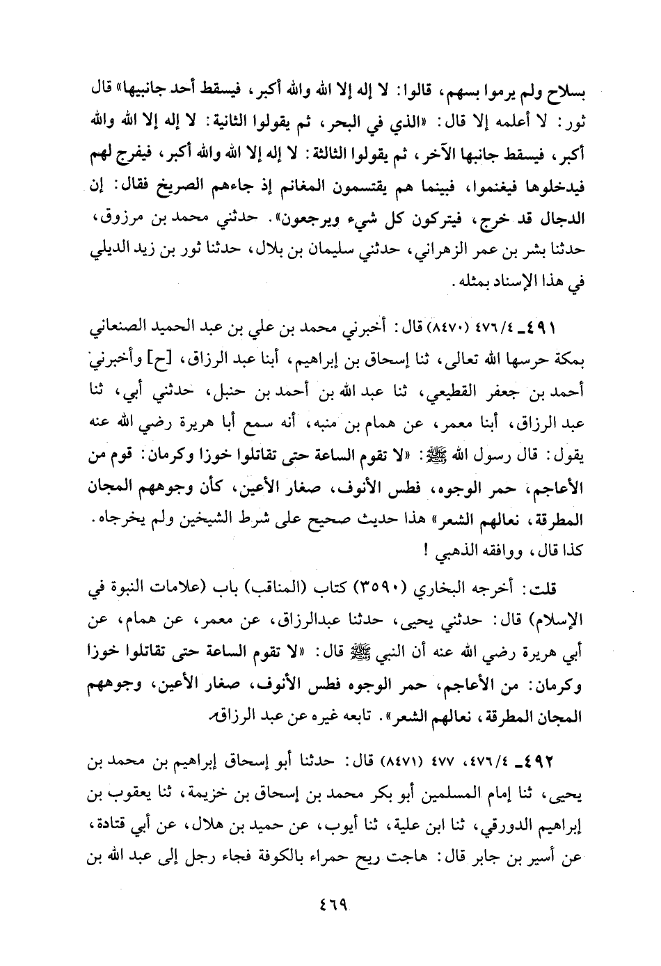 491 - 4/ 476 (8470) قال: أخبرني محمد بن علي بن عبد الحميد الصنعاني بمكة حرسها الله تعالى، ثنا إسحاق بن إبراهيم، أبنا عبد الرزاق، [ح] وأخبرني أحمد بن جعفر القطيعي، ثنا عبد الله بن أحمد بن حنبل، حدثني أبي، ثنا عبد الرزاق، أبنا معمر، عن همام بن منبه، أنه سمع أبا هريرة رضي الله عنه يقول: قال رسول الله - صلى الله عليه وسلم -: "لا تقوم الساعة حتى تقاتلوا خوزا وكرمان: قوم من الأعاجم، حمر الوجوه، فطس الأنوف، صغار الأعين، كأن وجوههم المجان المطرقة، نعالهم الشعر" هذا حديث صحيح على شرط الشيخين ولم يخرجاه. كذا قال، ووافقه الذهبي!