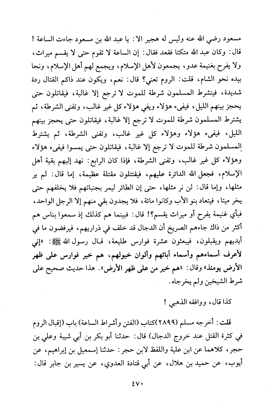 مسعود رضي الله عنه وليس له هجير الا: يا عبد الله بن مسعود جاءت الساعة! قال: وكان عبد الله متكئا فقعد فقال: إن الساعة لا تقوم حتى لا يقسم ميراث، ولا يفرح بغنيمة عدو، يجمعون لأهل الإسلام، ويجمع لهم أهل الإسلام، ونحا بيده نحو الشام، قلت: الروم تعني؟ قال: نعم، ويكون عند ذاكم القتال ردة شديدة، فيتشرط المسلمون شرطة للموت لا ترجع إلا غالبة، فيقاتلون حتى يحجز بينهم الليل، فيفىء هؤلاء ويفي هؤلاء كل غير غالب، وتفنى الشرطة، ثم يشترط المسلمون شرطة للموت لا ترجع إلا غالبة، فيقاتلون حتى يحجز بينهم الليل، فيفىء هؤلاء وهؤلاء كل غير غالب، وتفنى الشرطة، ثم يشترط المسلمون شرطة للموت لا ترجع إلا غالبة، فيقاتلون حتى يمسوا فيفىء هؤلاء وهؤلاء كل غير غالب، وتفنى الشرطة، فإذا كان الرابع: نهد إليهم بقية أهل الإسلام، فجعل الله الدائرة عليهم، فيقتتلون مقتلة عظيمة، إما قال: لم ير مثلها، وإما قال: لن نر مثلها، حتى إن الطائر ليمر بجنباتهم فلا يخلفهم حتى يخر ميتا، فيتعاد بنو الأب وكانوا مائة، فلا يجدون بقي منهم إلا الرجل الواحد، فبأي غنيمة يفرح أو ميراث يقسم؟! قال: فبينما هم كذلك إذ سمعوا بناس هم أكثر من ذاك جاءهم الصريخ أن الدجال قد خلف في ذراريهم، فيرفضون ما في أيديهم ويقبلون، فيبعثون عشرة فوارس طليعة، قال رسول الله - صلى الله عليه وسلم -: "إني لأعرف أسماءهم وأسماء آبائهم وألوان خيولهم، هم خير فوارس على ظهر الأرض يومئذ" وقال: "هم خير من على ظهر الأرض". هذا حديث صحيح على شرط الشيخين ولم يخرجاه.
