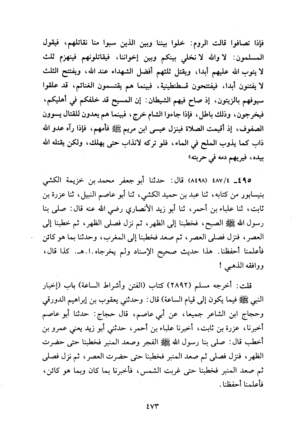 495 - 4/ 487 (8498) قال: حدثنا أبو جعفر محمد بن خزيمة الكشي بنيسابور من كتابه، ثنا عبد بن حميد الكشي، ثنا أبو عاصم النبيل، ثنا عزرة بن ثابت، ثنا علباء بن أحمر، ثنا أبو زيد الأنصاري رضي الله عنه قال: صلى بنا رسول الله - صلى الله عليه وسلم - الصبح، فخطبنا إلى الظهر، ثم نزل فصلى الظهر، ثم خطبنا إلى العصر، فنزل فصلى العصر، ثم صعد فخطبنا إلى المغرب، وحدثنا بما هو كائن فأعلمنا أحفظنا. هذا حديث صحيح الإسناد ولم يخرجاه. ا. هـ. كذا قال، ووافقه الذهبي!