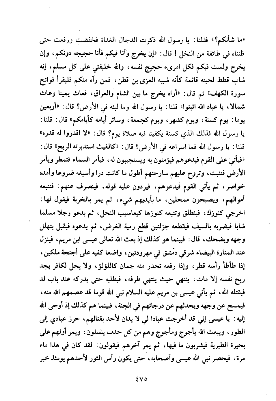 "ما شأنكم؟ " فقلنا: يا رسول الله ذكرت الدجال الغداة فخفضت ورفعت حتى ظنناه في طائفة من النخل! قال: "إن يخرج وأنا فيكم فأنا حجيجه دونكم، وإن يخرج ولست فيكم فكل امرىء حجيج نفسه، والله خليفتي على كل مسلم، إنه شاب قطط لحيته قائمة كأنه شبيه العزى بن قطن، فمن رآه منكم فليقرأ فواتح سورة الكهف" ثم قال: "أراه يخرج ما بين الشام والعراق، فعاث يمينا وعاث شمالا، يا عباد الله اثبتوا" قلنا: يا رسول الله وما لبثه في الأرض؟ قال: "أربعين يوما: يوم كسنة، ويوم كشهر، ويوم كجمعة، وسائر أيامه كأيامكم" قال: قلنا: يا رسول الله فذلك الذي كسنة يكفينا فيه صلاة يوم؟ قال: "لا اقدروا له قدره" قلنا: يا رسول الله فما اسراعه في الأرض؟ قال: "كالغيث استدبرته الريح " قال: "فيأتي على القوم فيدعوهم فيؤمنون به ويستجيبون له، فيأمر السماء فتمطر ويأمر الأرض فتنبت، وتروح عليهم سارحتهم أطول ما كانت درا وأسبغه ضروعا وأمده خواصر، ثم يأتي القوم فيدعوهم، فيردون عليه قوله، فينصرف عنهم: فتتبعه أموالهم، ويصبحون ممحلين، ما بأيديهم شيء، ثم يمر بالخربة فيقول لها: اخرجي كنوزك، فينطلق وتتبعه كنوزها كيعاسيب النحل، ثم يدعو رجلا مسلما شابا فيضربه بالسيف فيقطعه جزلتين قطع رمية الغرض، ثم يدعوه فيقبل يتهلل وجهه ويضحك، قال: فبينما هو كذلك إذ بعث الله تعالى عيسى ابن مريم، فينزل عند المنارة البيضاء شرقي دمشق في مهرودتين، واضعا كفيه على أجنحة ملكين، إذا طأطأ رأسه قطر، وإذا رفعه تحدر منه جمان كاللؤلؤ، ولا يحل لكافر يجد ريح نفسه إلا مات، ينتهي حيث ينتهي طرفه، فيطلبه حتى يدركه عند باب لد فيقتله الله، ثم يأتي عيسى بن مريم عليه السلام نبي الله قوما قد عصمهم الله منه، فيمسح عن وجهه ويحدثهم عن درجاتهم في الجنة، فبينما هم كذلك إذ أوحى الله إليه: يا عيسى إني قد أخرجت عبادا لي لا يدان لأحد بقتالهم، حرز عبادي إلى الطور، ويبعث الله يأجوج ومأجوج وهم من كل حدب ينسلون، ويمر أولهم على بحيرة الطبرية فيشربون ما فيها، ثم يمر آخرهم فيقولون: لقد كان في هذا ماء مرة، فيحصر نبي الله عيسى وأصحابه، حتى يكون رأس الثور لأحدهم يومئذ خير