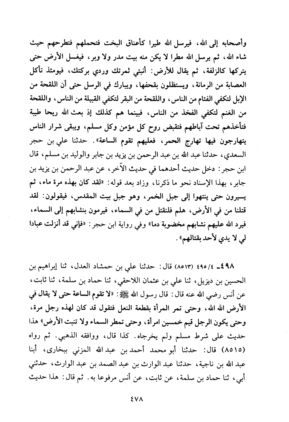 498 - 4/ 495 (8513) قال: حدثنا علي بن حمشاد العدل، ثنا إبراهيم بن الحسين بن ديزيل، ثنا علي بن عثمان اللاحقي، ثنا حماد بن سلمة، ثنا ثابت، عن أنس رضي الله عنه قال: قال رسول الله - صلى الله عليه وسلم -: "لا تقوم الساعة حتى لا يقال في الأرض الله الله، وحتى تمر المرأة بقطعة النعل فتقول قد كان لهذه رجل مرة، وحتى يكون الرجل قيم خمسين امرأة، وحتى تمطر السماء ولا تنبت الأرض" هذا حديث على شرط مسلم ولم يخرجاه. كذا قال، ووافقه الذهبي. ثم رواه (8515) قال: حدثنا أبو محمد أحمد بن عبد الله المزني ببخارى، أبنا عبد الله بن ناجية، حدثنا عبد الوارث بن عبد الصمد بن عبد الوارث، حدثني أبي، ثنا حماد بن سلمة، عن ثابت، عن أنس مرفوعا به. ثم قال: هذا حديث