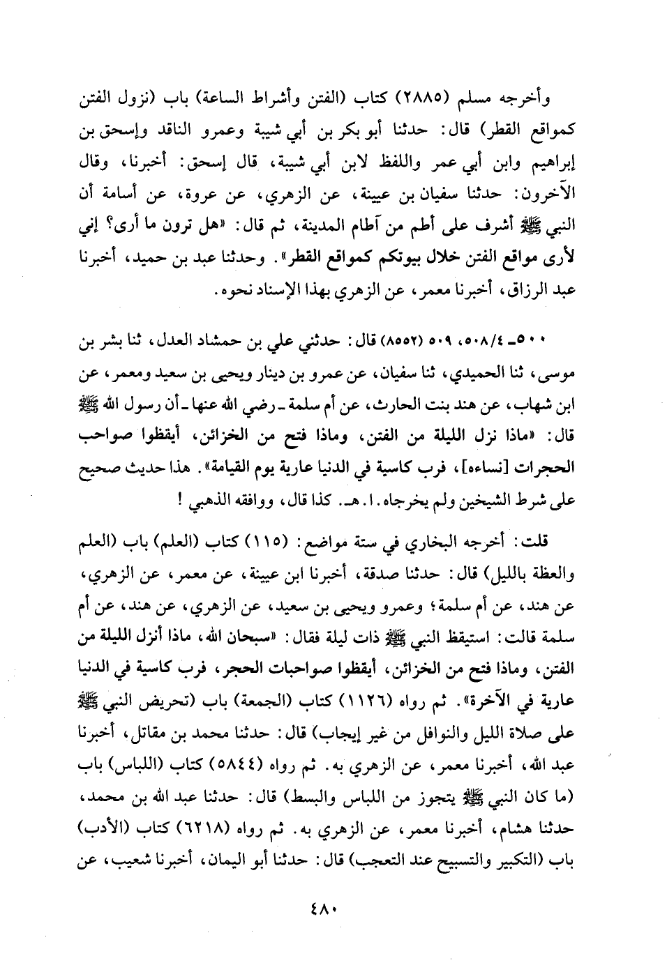 500 - 4/ 508، 509 (8552) قال: حدثني علي بن حمشاد العدل، ثنا بشر بن موسى، ثنا الحميدي، ثنا سفيان، عن عمرو بن دينار ويحيى بن سعيد ومعمر، عن ابن شهاب، عن هند بنت الحارث، عن أم سلمة - رضي الله عنها - أن رسول الله - صلى الله عليه وسلم - قال: "ماذا نزل الليلة من الفتن، وماذا فتح من الخزائن، أيقظوا صواحب الحجرات [نساءه]، فرب كاسية في الدنيا عارية يوم القيامة". هذا حديث صحيح على شرط الشيخين ولم يخرجاه. ا. هـ. كذا قال، ووافقه الذهبي!