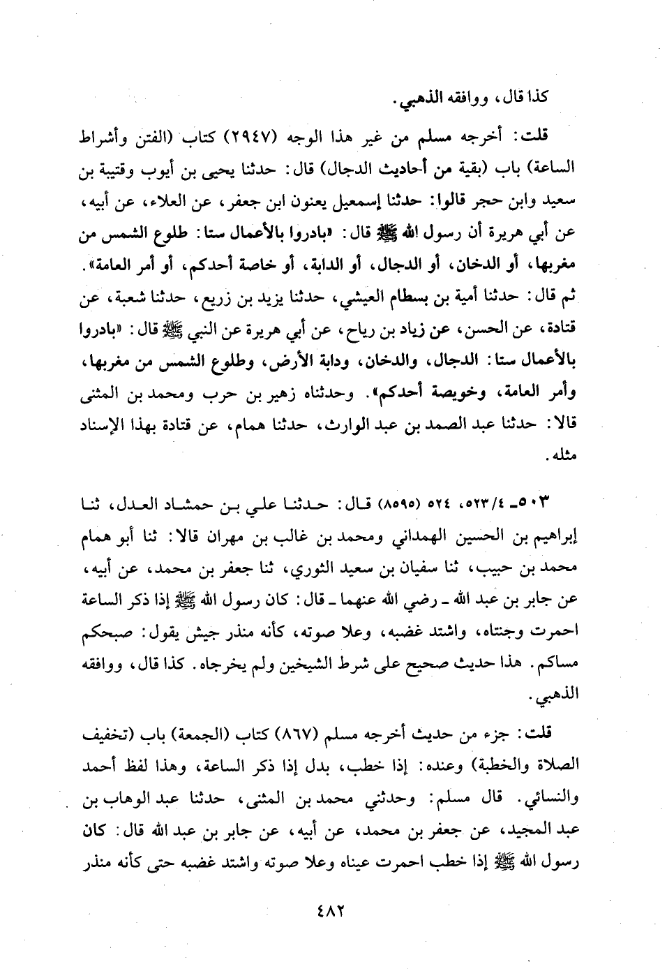 503 - 4/ 523، 524 (8595) قال: حدثنا علي بن حمشاد العدل، ثنا إبراهيم بن الحسين الهمداني ومحمد بن غالب بن مهران قالا: ثنا أبو همام محمد بن حبيب، ثنا سفيان بن سعيد الثوري، ثنا جعفر بن محمد، عن أبيه، عن جابر بن عبد الله - رضي الله عنهما - قال: كان رسول الله - صلى الله عليه وسلم - إذا ذكر الساعة احمرت وجنتاه، واشتد غضبه، وعلا صوته، كأنه منذر جيش يقول: صبحكم مساكم. هذا حديث صحيح على شرط الشيخين ولم يخرجاه. كذا قال، ووافقه الذهبي.