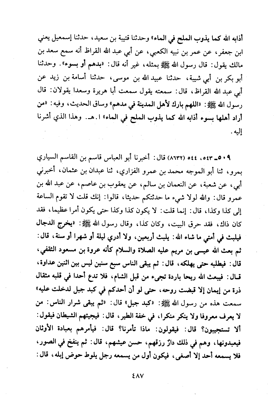 509 - 543، 544 (8632) قال: أخبرنا أبو العباس قاسم بن القاسم السياري بمرو، ثنا أبو الموجه محمد بن عمرو الفزاري، ثنا عبدان بن عثمان، أخبرني أبي، عن شعبة، عن النعمان بن سالم، عن يعقوب بن عاصم، عن عبد الله بن عمرو قال: والله لولا شيء ما حدثتكم حديثا، قالوا: إنك قلت لا تقوم الساعة إلى كذا وكذا، قال: إنما قلت: لا يكون كذا وكذا حتى يكون أمرا عظيما، فقد كان ذاك، فقد حرق البيت، وكان كذا، وقال رسول الله - صلى الله عليه وسلم -: "يخرج الدجال فيلبث في أمتي ما شاء الله: يلبث أربعين، ولا أدري ليلة أو شهرا أو سنة، قال: ثم بعث الله عيسى بن مريم عليه الصلاة والسلام كأنه عروة بن مسعود الثقفي، قال: فيطلبه حتى يهلكه، قال: ثم يبقى الناس سبع سنين ليس بين اثنين عداوة، قال: فيبعث الله ريحا باردة تجىء من قبل الشام، فلا تدع أحدا في قلبه مثقال ذرة من إيمان إلا قبضت روحه، حتى لو أن أحدكم في كبد جبل لدخلت عليه" سمعت هذه من رسول الله - صلى الله عليه وسلم -: "كبد جبل" قال: "ثم يبقى شرار الناس: من لا يعرف معروفا ولا ينكر منكرا، في خفة الطير، قال: فيجيئهم الشيطان فيقول: ألا تستجيبون؟ قال: فيقولون: ماذا تأمرنا؟ قال: فيأمرهم بعبادة الأوثان فيعبدونها، وهم في ذلك دارٌ رزقهم، حسن عيشهم، قال: ثم ينفخ في الصور، فلا يسمعه أحد إلا أصغى، فيكون أول من يسمعه رجل يلوط حوض إبله، قال: