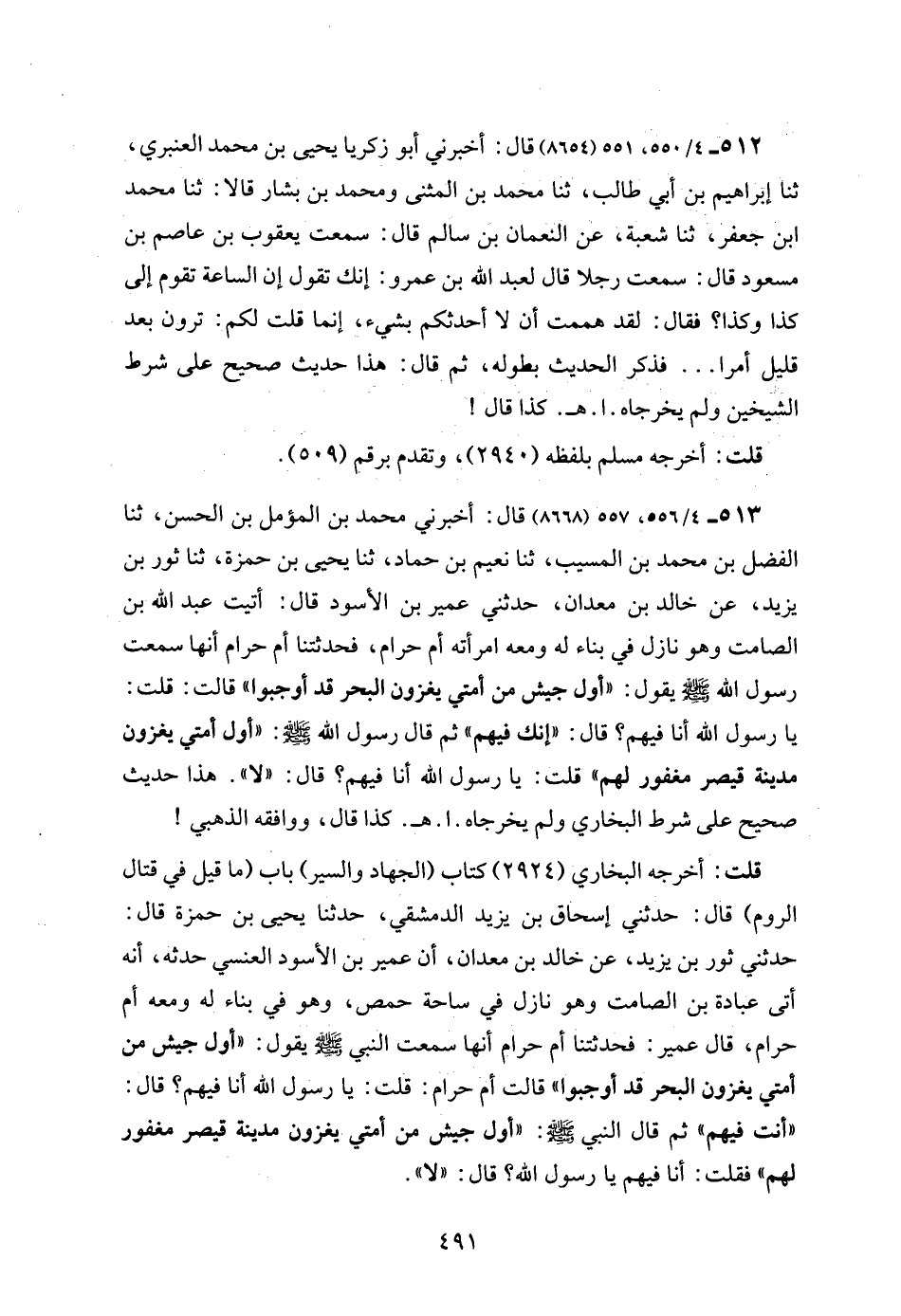 513 - 4/ 556، 557 (8668) قال: أخبرني محمد بن المؤمل بن الحسن، ثنا الفضل بن محمد بن المسيب، ثنا نعيم بن حماد، ثنا يحيى بن حمزة، ثنا ثور بن يزيد، عن خالد بن معدان، حدثني عمير بن الأسود قال: أتيت عبد الله بن الصامت وهو نازل في بناء له ومعه امرأته أم حرام، فحدثتنا أم حرام أنها سمعت رسول الله - صلى الله عليه وسلم - يقول: "أول جيش من أمتي يغزون البحر قد أوجبوا" قالت: قلت: يا رسول الله أنا فيهم؟ قال: "إنك فيهم" ثم قال رسول الله - صلى الله عليه وسلم -: "أول أمتي يغزون مدينة قيصر مغفور لهم" قلت: يا رسول الله أنا فيهم؟ قال: "لا". هذا حديث صحيح على شرط البخاري ولم يخرجاه. ا. هـ. كذا قال، ووافقه الذهبي!