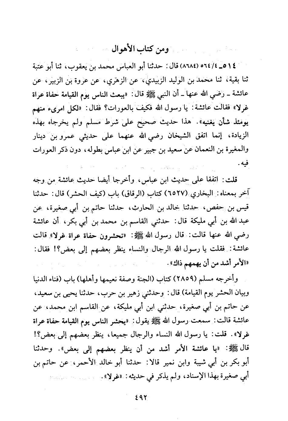 514 - 4/ 564 (8684) قال: حدثنا أبو العباس محمد بن يعقوب، ثنا أبو عتبة ثنا بقية، ثنا محمد بن الوليد الزبيدي، عن الزهري، عن عروة بن الزبير، عن عائشة - رضي الله عنها - أن النبي - صلى الله عليه وسلم - قال: "يبعث الناس يوم القيامة حفاة عراة غرلا" فقالت عائشة: يا رسول الله فكيف بالعورات؟ فقال: "لكل امرىء منهم يومئذ شأن يغنيه". هذا حديث صحيح على شرط مسلم ولم يخرجاه بهذه الزيادة، إنما اتفق الشيخان رضي الله عنهما على حديثي عمرو بن دينار والمغيرة بن النعمان عن سعيد بن جبير عن ابن عباس بطوله، دون ذكر العورات فيه.
