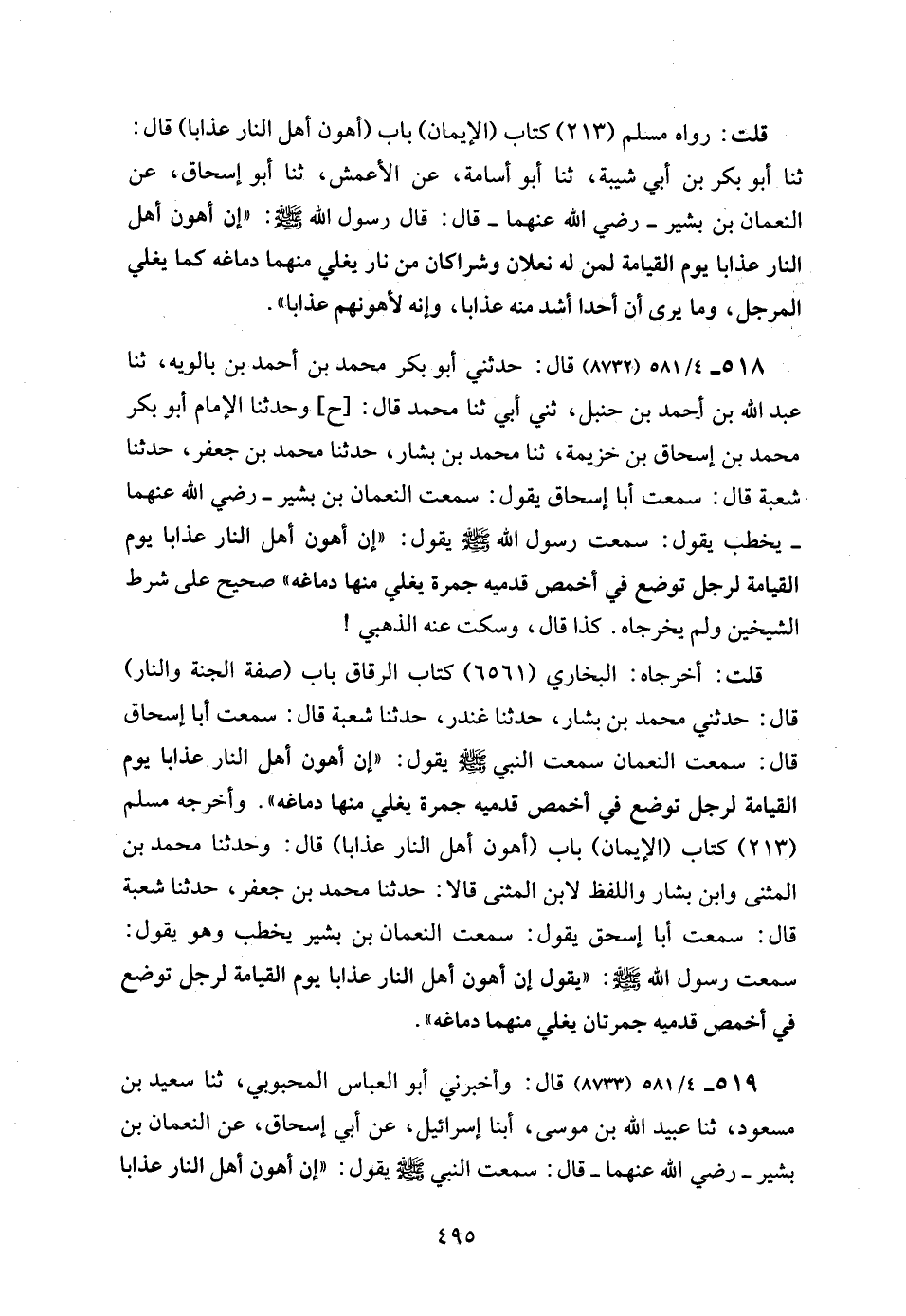 518 - 4/ 581 (8732) قال: حدثني أبو بكر محمد بن أحمد بن بالويه، ثنا عبد الله بن أجمد بن حنبل، ثني أبي ثنا محمد قال: [ح] وحدثنا الإمام أبو بكر محمد بن إسحاق بن خزيمة، ثنا محمد بن بشار، حدثنا محمد بن جعفر، حدثنا شعبة قال: سمعت أبا إسحاق يقول: سمعت النعمان بن بشير - رضي الله عنهما - يخطب يقول: سمعت رسول الله - صلى الله عليه وسلم - يقول: "إن أهون أهل النار عذابا يوم القيامة لرجل توضع في أخمص قدميه جمرة يغلي منها دماغه" صحيح على شرط الشيخين ولم يخرجاه. كذا قال، وسكت عنه الذهبي!