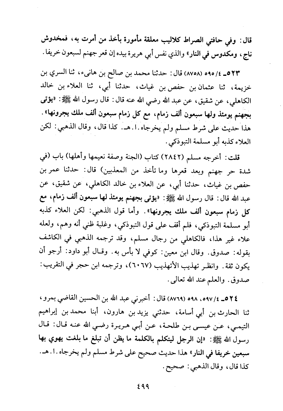 523 - 4/ 595 (8758) قال: حدثنا محمد بن صالح بن هانىء، ثنا السري بن خزيمة، ثنا عثمان بن حفص بن غياث، حدثنا أبي، ثنا العلاء بن خالد الكاهلي، عن شقيق، عن عبد الله رضي الله عنه قال: قال رسول الله - صلى الله عليه وسلم -: "يؤتى بجهنم يومئذ ولها سبعون ألف زمام، مع كل زمام سبعون ألف ملك يجرونها". هذا حديث على شرط مسلم ولم يخرجاه. ا. هـ. كذا قال، وقال الذهبي: لكن العلاء كذبه أبو مسلمة التبوذكي.