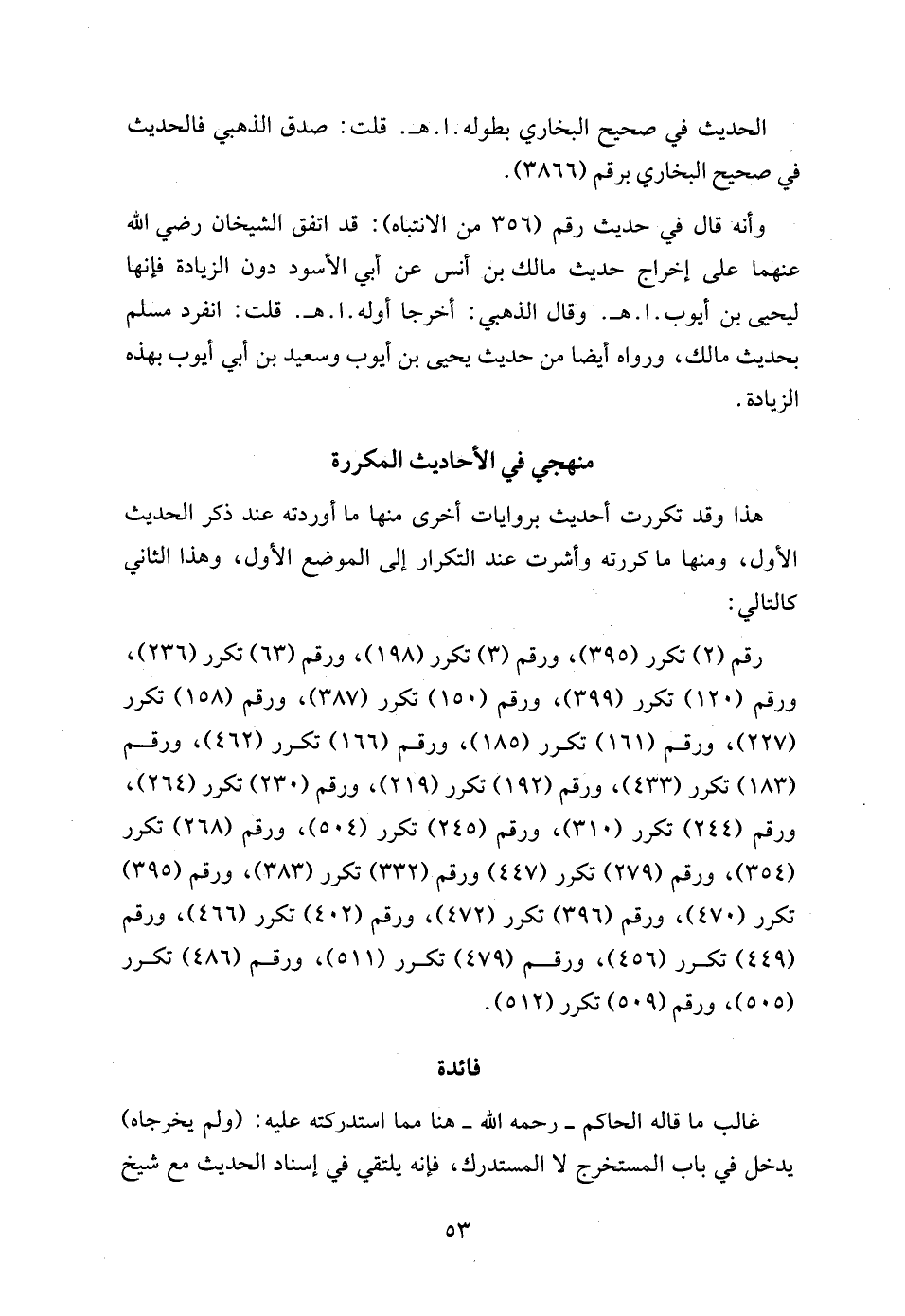 هذا وقد تكررت أحاديث بروايات أخرى منها ما أوردته عند ذكر الحديث الأول، ومنها ما كررته وأشرت عند التكرار إلى الموضع الأول، وهذا الثاني كالتالي: