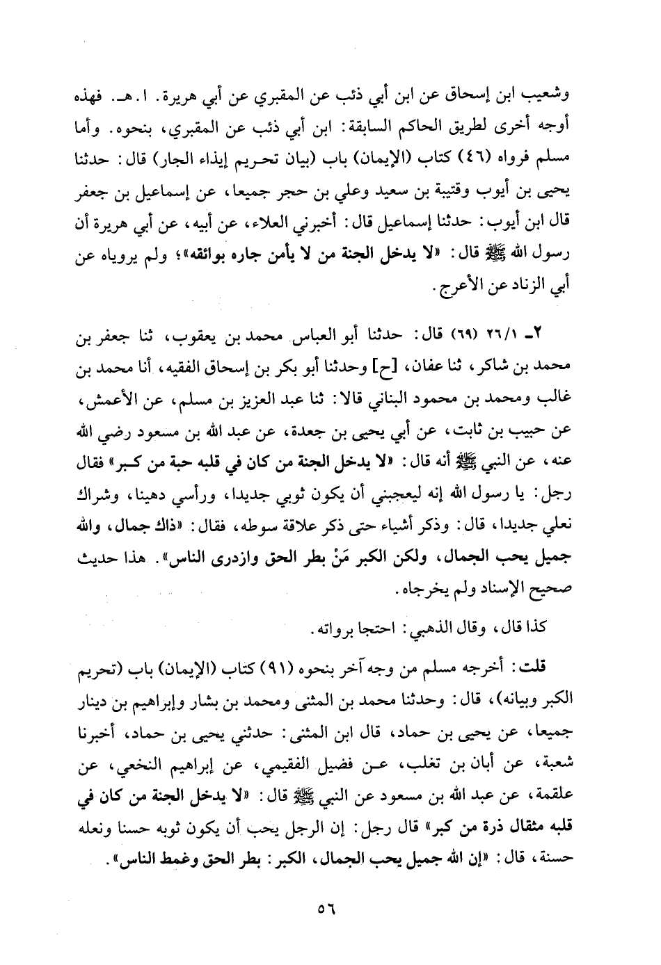 2 - 1/ 26 (69) قال: حدثنا أبو العباس محمد بن يعقوب، ثنا جعفر بن محمد بن شاكر، ثنا عفان، [ح] وحدثنا أبو بكر بن إسحاق الفقيه، أنا محمد بن غالب ومحمد بن محمود البناني قالا: ثنا عبد العزيز بن مسلم، عن الأعمش، عن حبيب بن ثابت، عن أبي يحيى بن جعدة، عن عبد الله بن مسعود رضي الله عنه، عن النبي - صلى الله عليه وسلم - أنه قال: "لا يدخل الجنة من كان في قلبه حبة من كبر" فقال رجل: يا رسول الله إنه ليعجبني أن يكون ثوبي جديدا، ورأسي دهينا، وشراك نعلي جديدا، قال: وذكر أشياء حتى ذكر علاقة سوطه، فقال: "ذاك جمال، والله جميل يحب الجمال، ولكن الكبر مَنْ بطر الحق وازدرى الناس". هذا حديث صحيح الإسناد ولم يخرجاه.