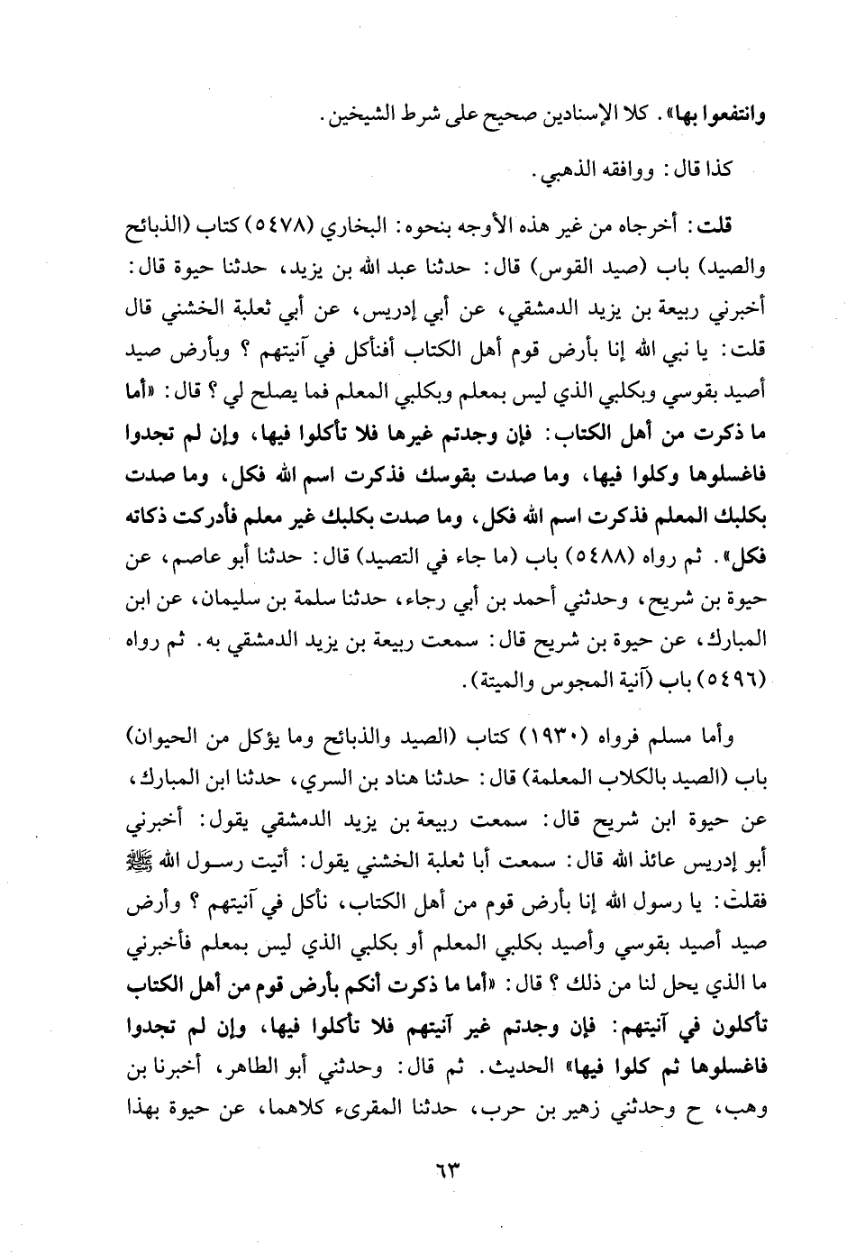 قلت: أخرجاه من غير هذه الأوجه بنحوه: البخاري (5478) كتاب (الذبائح والصيد) باب (صيد القوس) قال: حدثنا عبد الله بن يزيد، حدثنا حيوة قال: أخبرني ربيعة بن يزيد الدمشقي، عن أبي إدريس، عن أبي ثعلبة الخشني قال قلت: يا نبي الله إنا بأرض قوم أهل الكتاب أفنأكل في آنيتهم؟ وبأرض صيد أصيد بقوسي وبكلبي الذي ليس بمعلم وبكلبي المعلم فما يصلح لي؟ قال: "أما ما ذكرت من أهل الكتاب: فإن وجدتم غيرها فلا تأكلوا فيها، وإن لم تجدوا فاغسلوها وكلوا فيها، وما صدت بقوسك فذكرت اسم الله فكل، وما صدت بكلبك المعلم فذكرت اسم الله فكل، وما صدت بكلبك غير معلم فأدركت ذكاته فكل". ثم رواه (5488) باب (ما جاء في التصيد) قال: حدثنا أبو عاصم، عن حيوة بن شريح، وحدثني أحمد بن أبي رجاء، حدثنا سلمة بن سليمان، عن ابن المبارك، عن حيوة بن شريح قال: سمعت ربيعة بن يزيد الدمشقي به. ثم رواه (5496) باب (آنية المجوس والميتة).