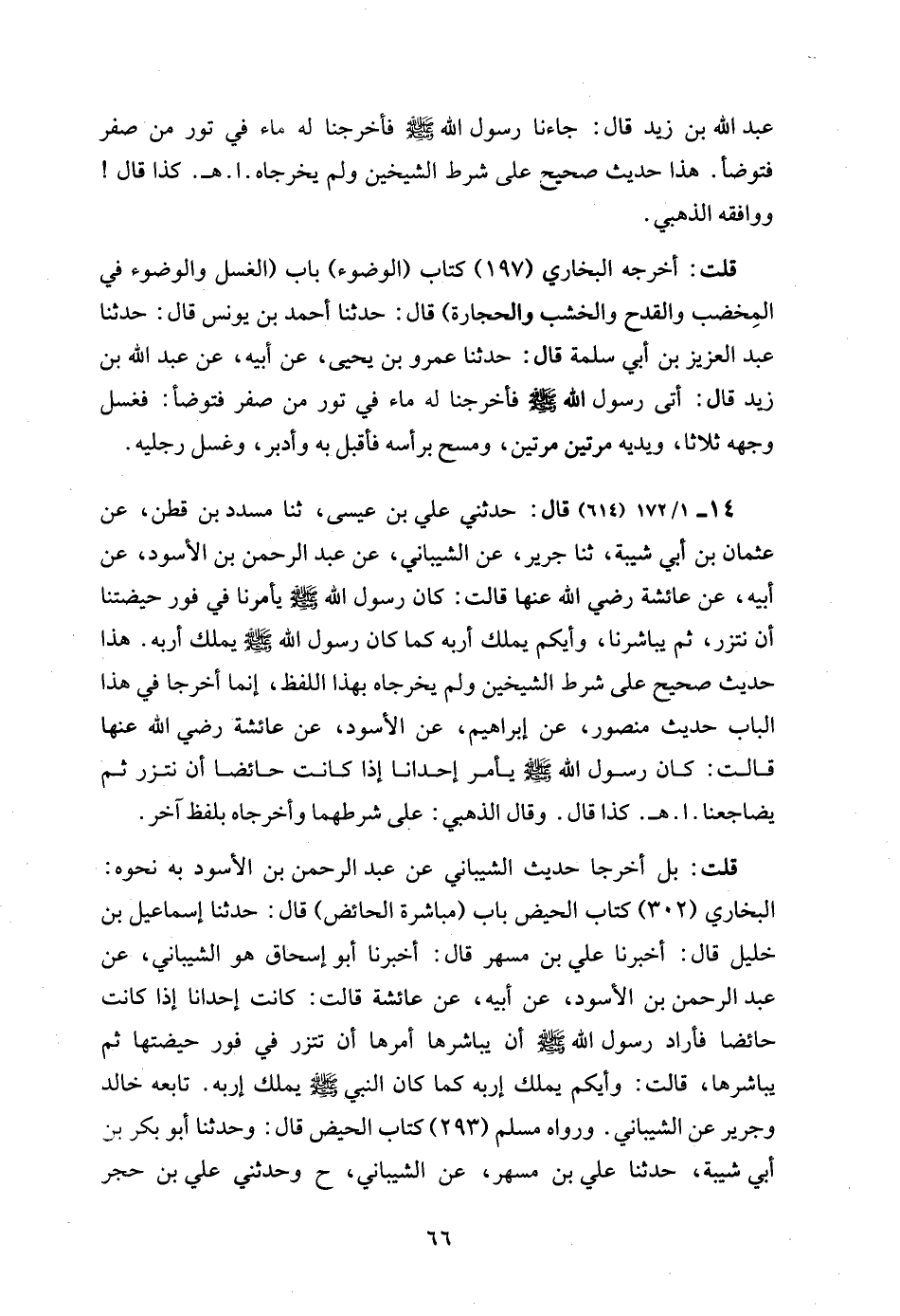 14 - 1/ 172 (614) قال: حدثني علي بن عيسى، ثنا مسدد بن قطن، عن عثمان بن أبي شيبة، ثنا جرير، عن الشيباني، عن عبد الرحمن بن الأسود، عن أبيه، عن عائشة رضي الله عنها قالت: كان رسول الله - صلى الله عليه وسلم - يأمرنا في فور حيضتنا أن نتزر، ثم يباشرنا، وأيكم يملك أربه كما كان رسول الله - صلى الله عليه وسلم - يملك أربه. هذا حديث صحيح على شرط الشيخين ولم يخرجاه بهذا اللفظ، إنما أخرجا في هذا الباب حديث منصور، عن إبراهيم، عن الأسود، عن عائشة رضي الله عنها قالت: كان رسول الله - صلى الله عليه وسلم - يأمر إحدانا إذا كانت حائضا أن نتزر ثم يضاجعنا. ا. هـ. كذا قال. وقال الذهبي: على شرطهما وأخرجاه بلفظ آخر.