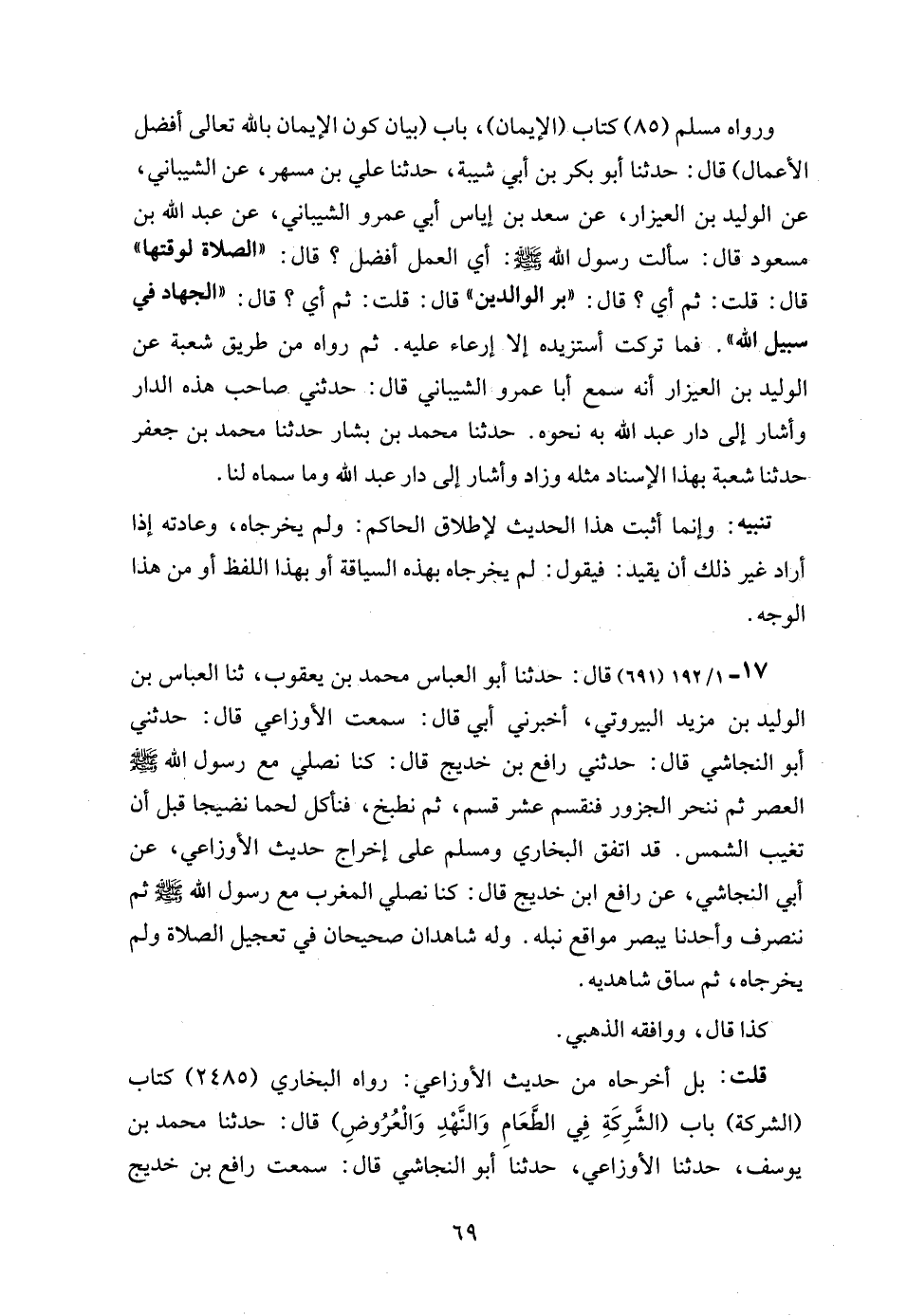 17 - 1/ 192 (691) قال: حدثنا أبو العباس محمد بن يعقوب، ثنا العباس بن الوليد بن مزيد البيروتي، أخبرني أبي قال: سمعت الأوزاعي قال: حدثني أبو النجاشي قال: حدثني رافع بن خديج قال: كنا نصلي مع رسول الله - صلى الله عليه وسلم - العصر ثم ننحر الجزور فنقسم عشر قسم، ثم نطبخ، فنأكل لحما نضيجا قبل أن تغيب الشمس. قد اتفق البخاري ومسلم على إخراج حديث الأوزاعي، عن أبي النجاشي، عن رافع ابن خديج قال: كنا نصلي المغرب مع رسول الله - صلى الله عليه وسلم - ثم ننصرف وأحدنا يبصر مواقع نبله. وله شاهدان صحيحان في تعجيل الصلاة ولم يخرجاه، ثم ساق شاهديه.