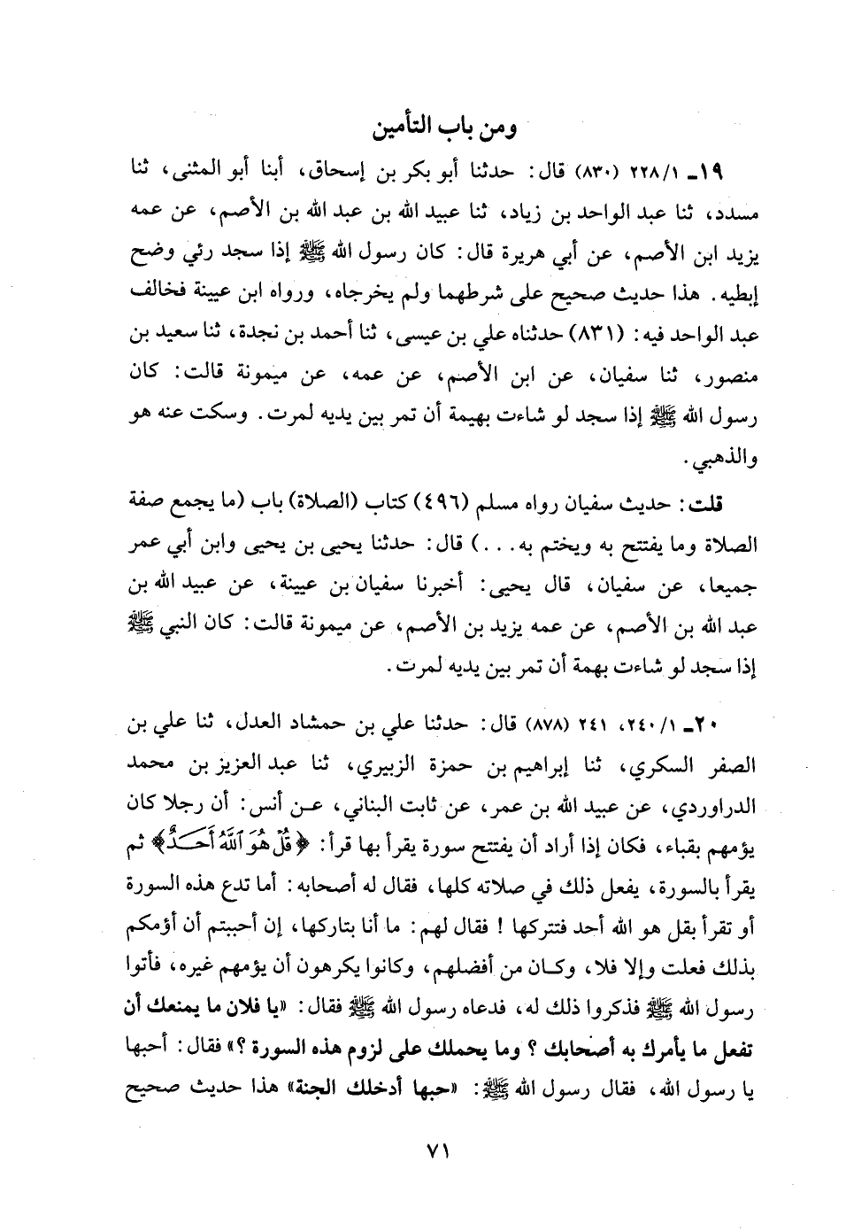 20 - 1/ 240، 241 (878) قال: حدثنا علي بن حمشاد العدل، ثنا علي بن الصفر السكري، ثنا إبراهيم بن حمزة الزبيري، ثنا عبد العزيز بن محمد الدراوردي، عن عبيد الله بن عمر، عن ثابت البناني، عن أنس: أن رجلا كان يؤمهم بقباء، فكان إذا أراد أن يفتتح سورة يقرأ بها قرأ: {قُلْ هُوَ اللَّهُ أَحَدٌ} ثم يقرأ بالسورة، يفعل ذلك في صلاته كلها، فقال له أصحابه: أما تدع هذه السورة أو تقرأ بقل هو الله أحد فتتركها! فقال لهم: ما أنا بتاركها، إن أحببتم أن أؤمكم بذلك فعلت وإلا فلا، وكان من أفضلهم، وكانوا يكرهون أن يؤمهم غيره، فأتوا رسول الله - صلى الله عليه وسلم - فذكروا ذلك له، فدعاه رسول الله - صلى الله عليه وسلم - فقال: "يا فلان ما يمنعك أن تفعل ما يأمرك به أصحابك؟ وما يحملك على لزوم هذه السورة؟ " فقال: أحبها يا رسول الله، فقال رسول الله - صلى الله عليه وسلم -: "حبها أدخلك الجنة" هذا حديث صحيح