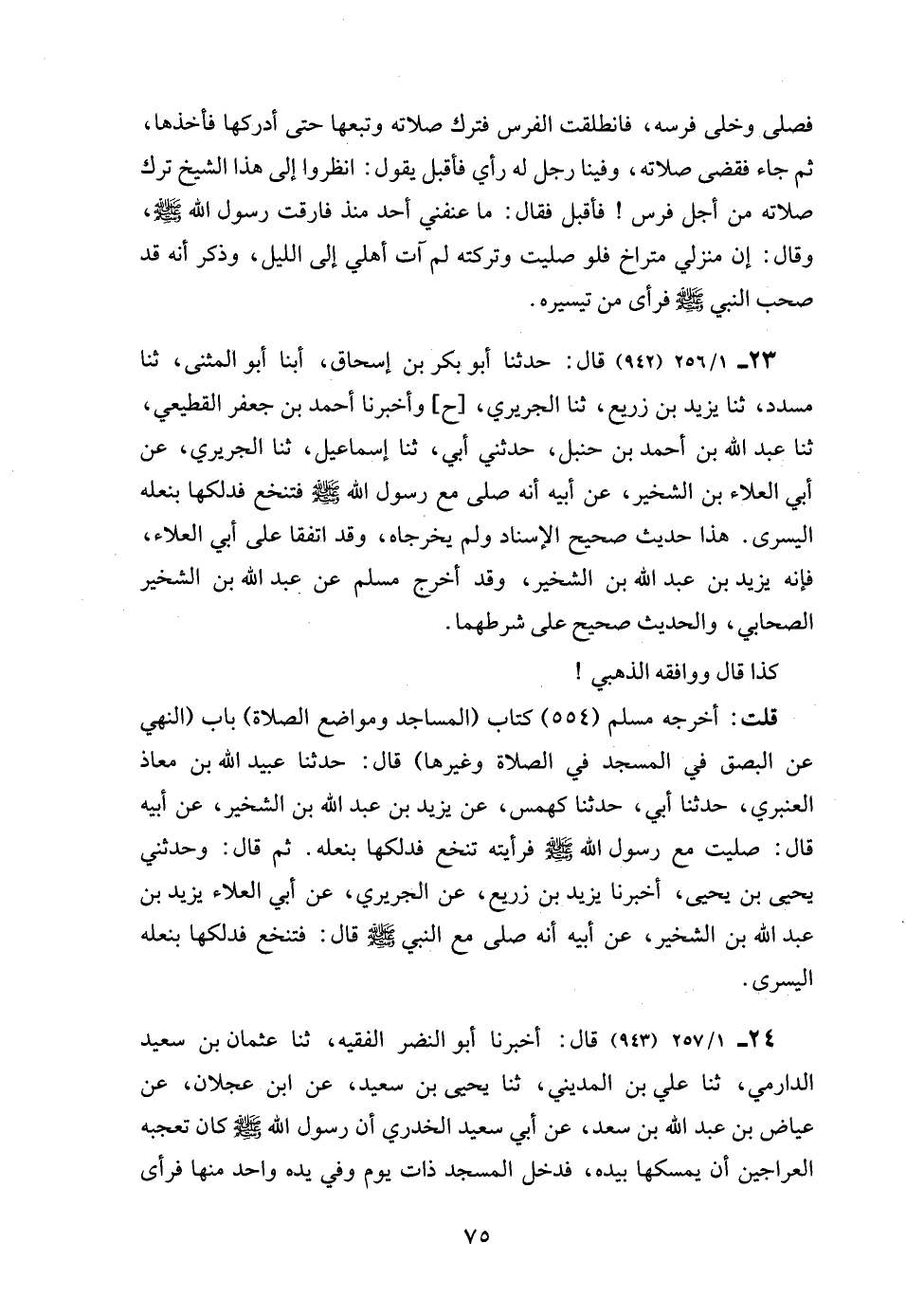 23 - 1/ 256 (942) قال: حدثنا أبو بكر بن إسحاق، أبنا أبو المثنى، ثنا مسدد، ثنا يزيد بن زريع، ثنا الجريري، [ح] وأخبرنا أحمد بن جعفر القطيعي، ثنا عبد الله بن أحمد بن حنبل، حدثني أبي، ثنا إسماعيل، ثنا الجريري، عن أبي العلاء بن الشخير، عن أبيه أنه صلى مع رسول الله - صلى الله عليه وسلم - فتنخع فدلكها بنعله اليسرى. هذا حديث صحيح الإسناد ولم يخرجاه، وقد اتفقا على أبي العلاء، فإنه يزيد بن عبد الله بن الشخير، وقد أخرج مسلم عن عبد الله بن الشخير الصحابي، والحديث صحيح على شرطهما.