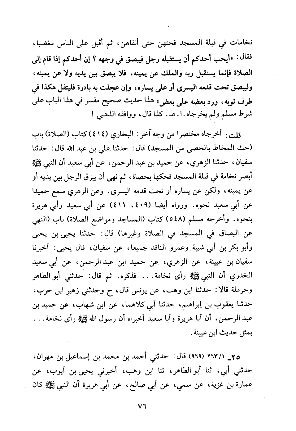 قلت أخرجاه مختصرا من وجه آخر: البخاري (414) كتاب (الصلاة) باب (حك المخاط بالحصى من المسجد) قال: حدثنا علي بن عبد الله قال: حدثنا سفيان، حدثنا الزهري، عن حميد بن عبد الرحمن، عن أبي سعيد أن النبي - صلى الله عليه وسلم - أبصر نخامة في قبلة المسجد فحكها بحصاة، ثم نهى أن يبزق الرجل بين يديه أو عن يمينه، ولكن عن يساره أو تحت قدمه اليسرى. وعن الزهري سمع حميدا عن أبي سعيد نحوه. ورواه أيضا (409، 411) عن أبي سعيد وأبي هريرة بنحوه. وأخرجه مسلم (548) كتاب (المساجد ومواضع الصلاة) باب (النهي عن البصاق في المسجد في الصلاة وغيرها) قال: حدثنا يحيى بن يحيى وأبو بكر بن أبي شيبة وعمرو الناقد جميعا، عن سفيان، قال يحيى: أخبرنا سفيان بن عيينة، عن الزهري، عن حميد ابن عبد الرحمن، عن أبي سعيد الخدري أن النبي - صلى الله عليه وسلم - رأى نخامة ... فذكره. ثم قال: حدثني أبو الطاهر وحرملة قالا: حدثنا ابن وهب، عن يونس قال، ح وحدثني زهير ابن حرب، حدثنا يعقوب بن إبراهيم، حدثنا أبي كلاهما، عن ابن شهاب، عن حميد بن عبد الرحمن، أن أبا هريرة وأبا سعيد أخبراه أن رسول الله - صلى الله عليه وسلم - رأى نخامة ... بمثل حديث ابن عيينة.