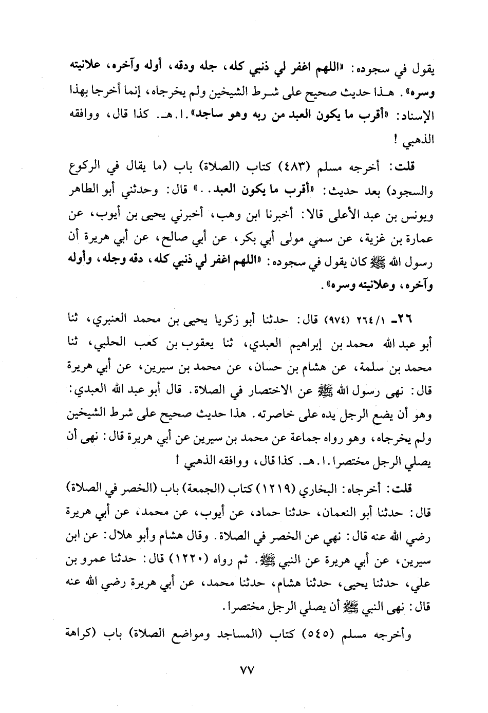 26 - 1/ 264 (974) قال: حدثنا أبو زكريا يحيى بن محمد العنبري، ثنا أبو عبد الله محمد بن إبراهيم العبدي، ثنا يعقوب بن كعب الحلبي، ثنا محمد بن سلمة، عن هشام بن حسان، عن محمد بن سيرين، عن أبي هريرة قال: نهى رسول الله - صلى الله عليه وسلم - عن الاختصار في الصلاة. قال أبو عبد الله العبدي: وهو أن يضع الرجل يده على خاصرته. هذا حديث صحيح على شرط الشيخين ولم يخرجاه، وهو رواه جماعة عن محمد بن سيرين عن أبي هريرة قال: نهى أن يصلي الرجل مختصرا. ا. هـ. كذا قال، ووافقه الذهبي!