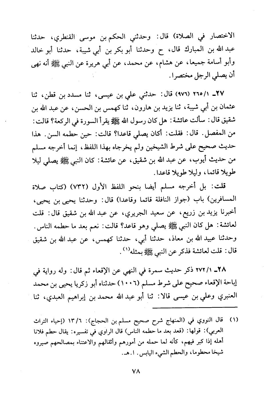 الاختصار في الصلاة) قال: وحدثني الحكم بن موسى القنطري، حدثنا عبد الله بن المبارك قال، ح وحدثنا أبو بكر بن أبي شيبة، حدثنا أبو خالد وأبو أسامة جميعا، عن هشام، عن محمد، عن أبي هريرة عن النبي - صلى الله عليه وسلم - أنه نهى أن يصلي الرجل مختصرا.
