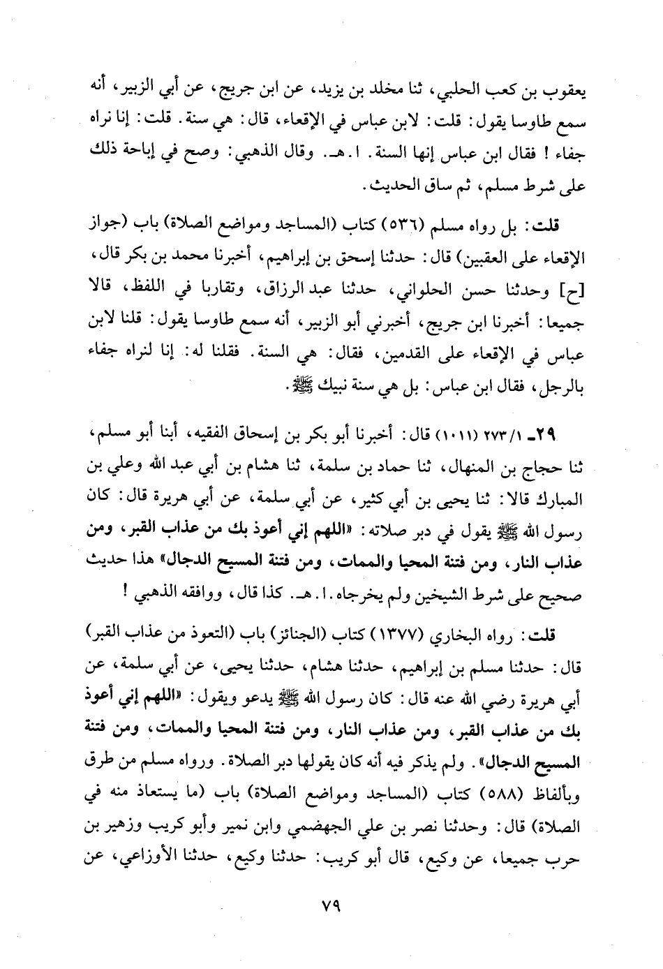 29 - 1/ 273 (1011) قال: أخبرنا أبو بكر بن إسحاق الفقيه، أبنا أبو مسلم، ثنا حجاج بن المنهال، ثنا حماد بن سلمة، ثنا هشام بن أبي عبد الله وعلي بن المبارك قالا: ثنا يحيى بن أبي كثير، عن أبي سلمة، عن أبي هريرة قال: كان رسول الله - صلى الله عليه وسلم - يقول في دبر صلاته: "اللهم إني أعوذ بك من عذاب القبر، ومن عذاب النار، ومن فتنة المحيا والممات، ومن فتنة المسيح الدجال" هذا حديث صحيح على شرط الشيخين ولم يخرجاه. ا. هـ. كذا قال، ووافقه الذهبي!